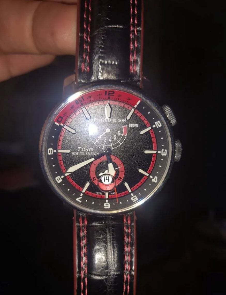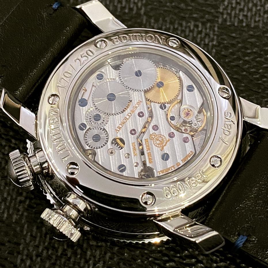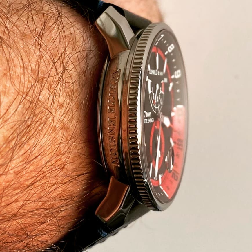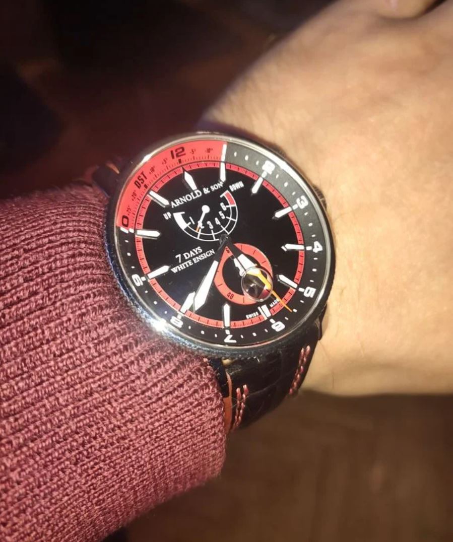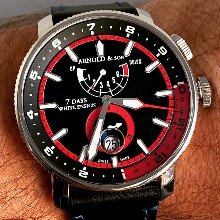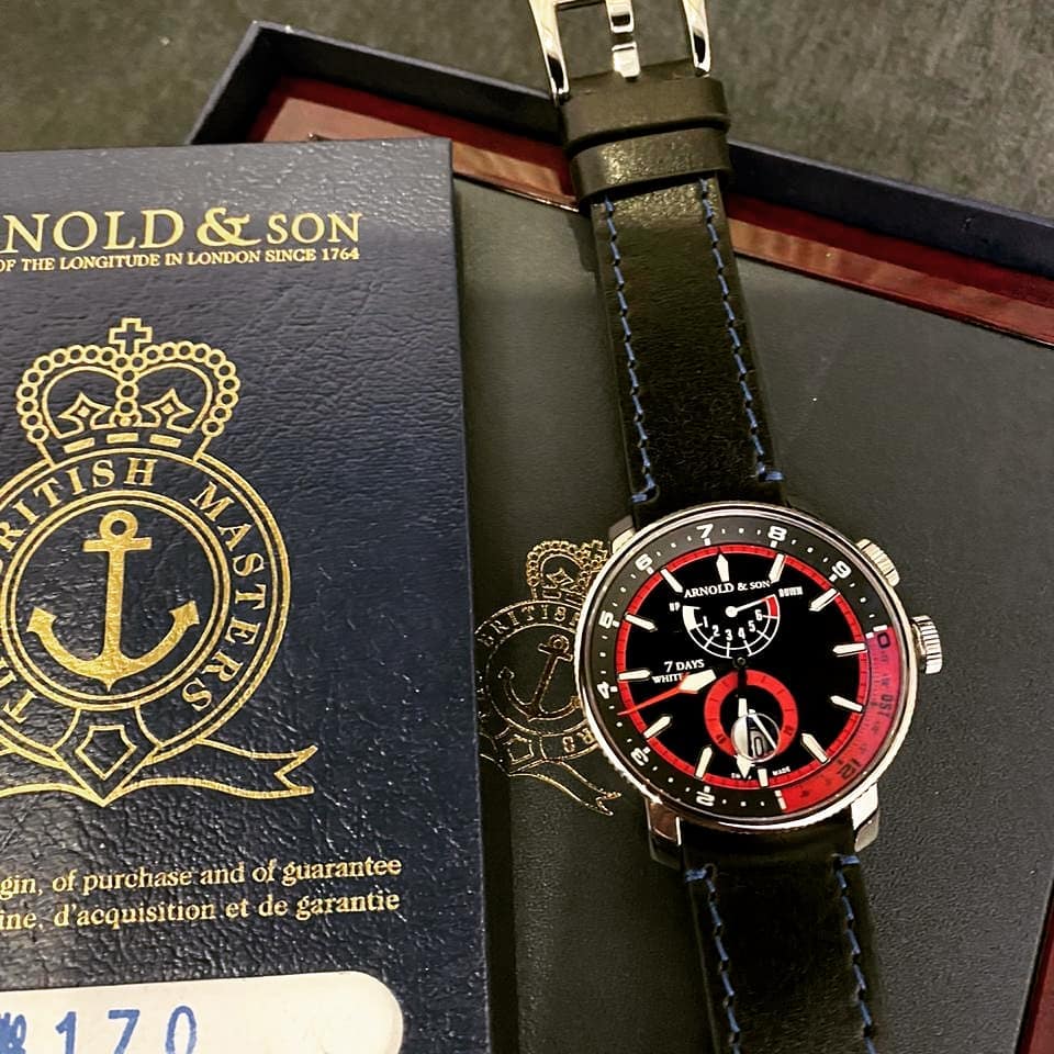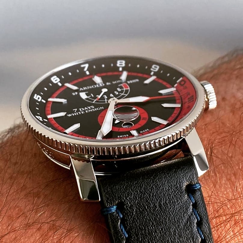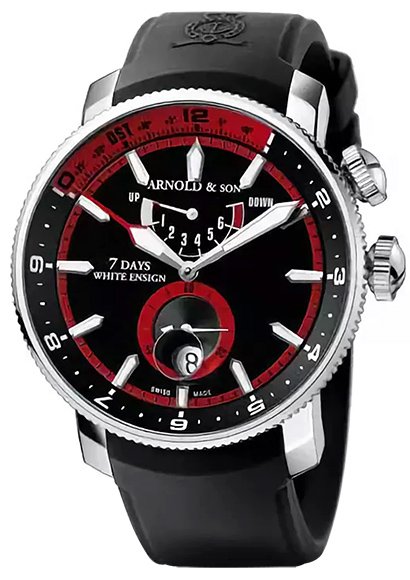 Элитные, надежные и престижные лимитированные 250 экземплярами швейцарские Arnold & Son White Ensign 7 days в стальном корпусе 44мм на крокодиловом ремне с оригинальной стальной баклей. Плюс второй кожаный ремень в подарок. Модель White Ensign - с маленьким секундным циферблатом, круглым окошком даты и индикатором запаса хода на целых 7 дней на мануфактурном калибре с ручным заводом. Вращающийся безель со шкалой второго времени и индикатором коррекции зимнего/летнего времени. Корпус из нержавеющей стали, 44,5 мм. Циферблат черного цвета с контрастной красной отделкой. Запас хода 7 дней. Уникальный механизм с ручным заводом потрясающей красоты, который можно видеть сквозь прозрачную заднюю крышку. Водонепроницаемость 200 метров, что позволяет свободно плавать в этих часах. Удобный индикатор запаса хода Power Reserve, показывающий остаток завода из 7 дней полностью заведенной пружины. Идеальное состояние. Полный комплект, включая шкатулку из красного дерева. Красивый номер 170 из 250 штук на весь мир. Ритейл 11500$, что в пересчете на текущий курс почти 900.000 рублей. Гарантия на часы до ноября 2020 от известной и престижной часовой мастерской в Москве. Возможен обмен на швейцарские часы известных брендов с вашей доплатой.