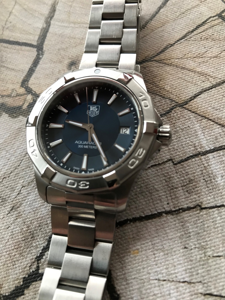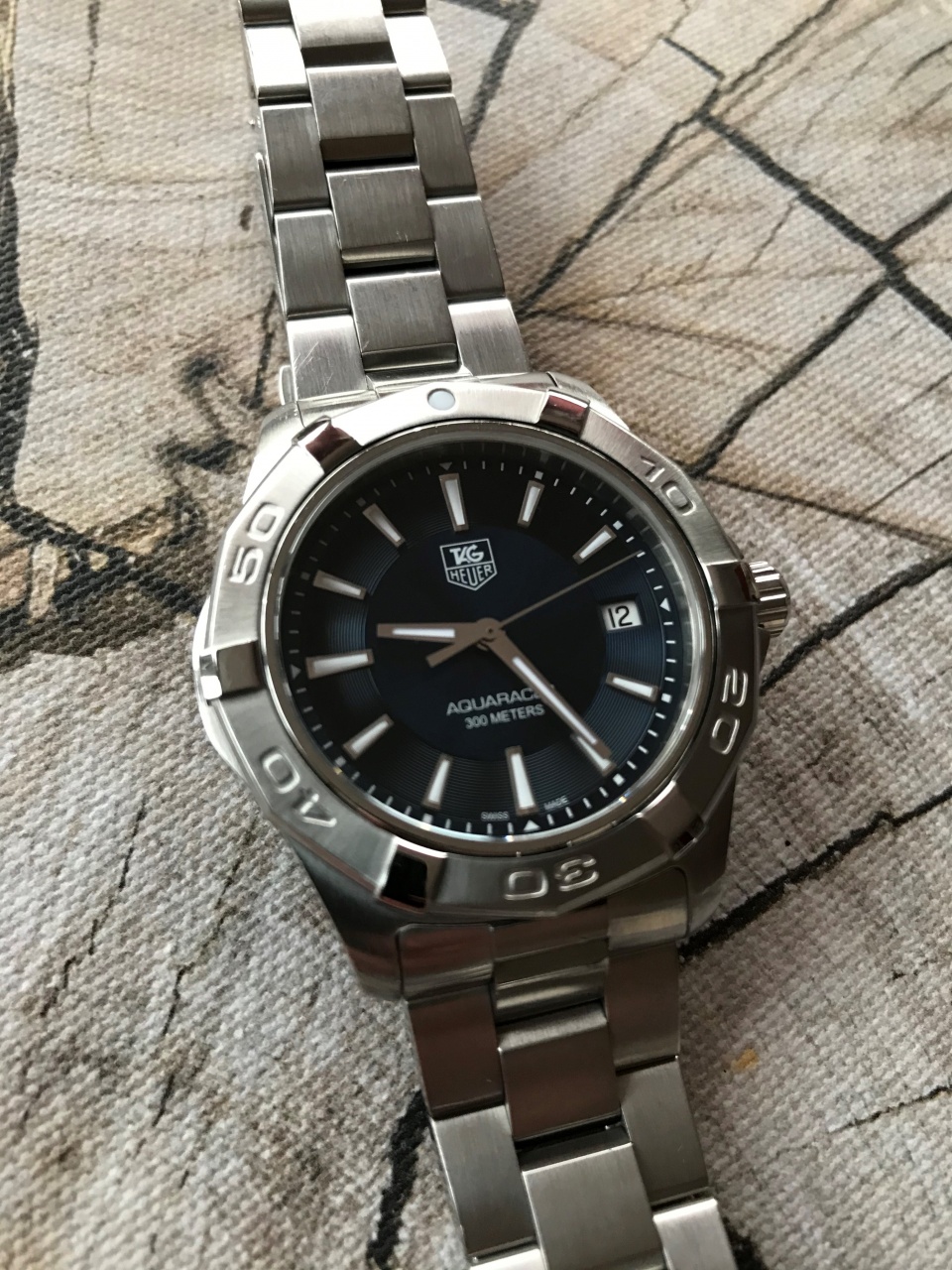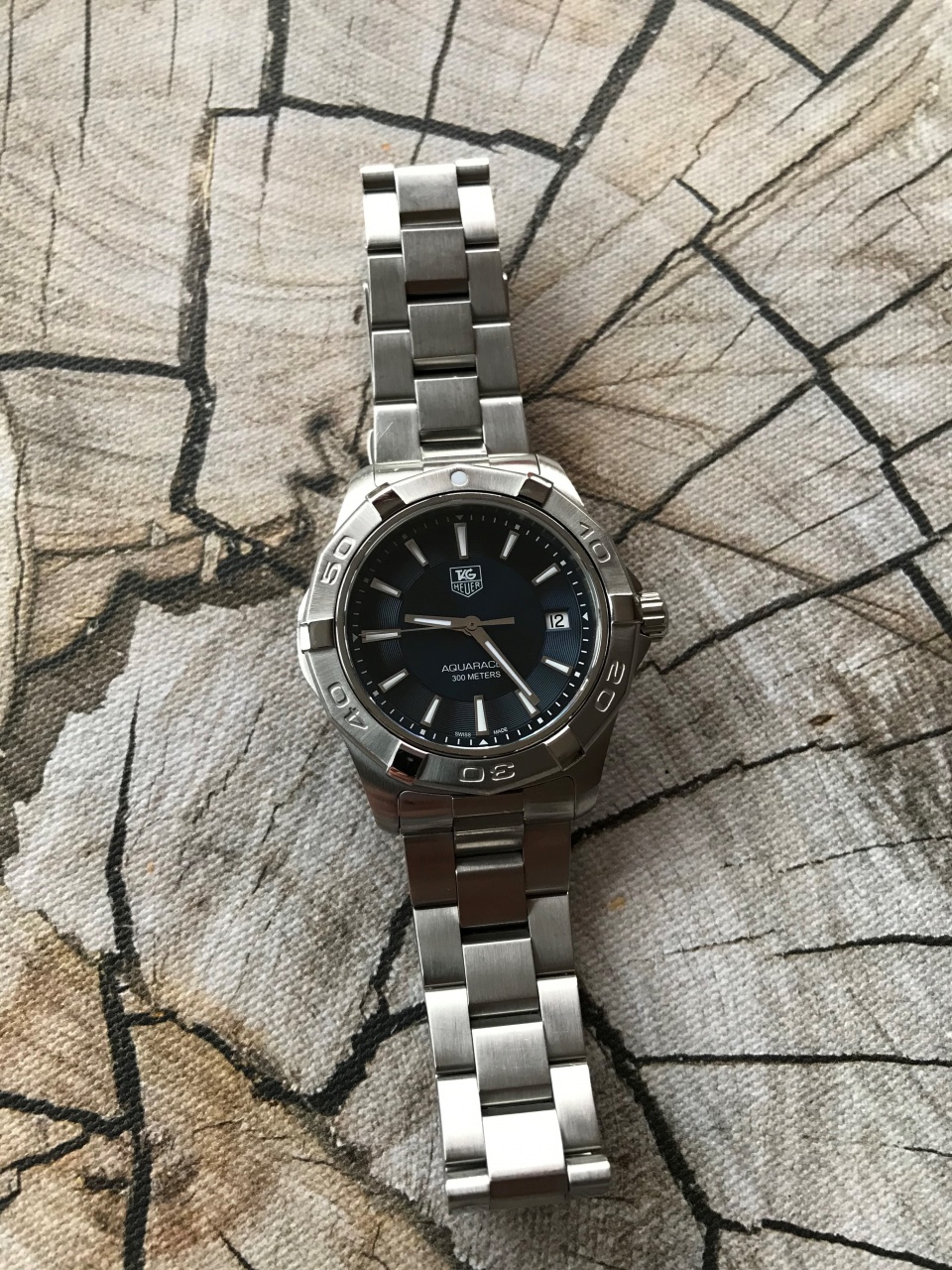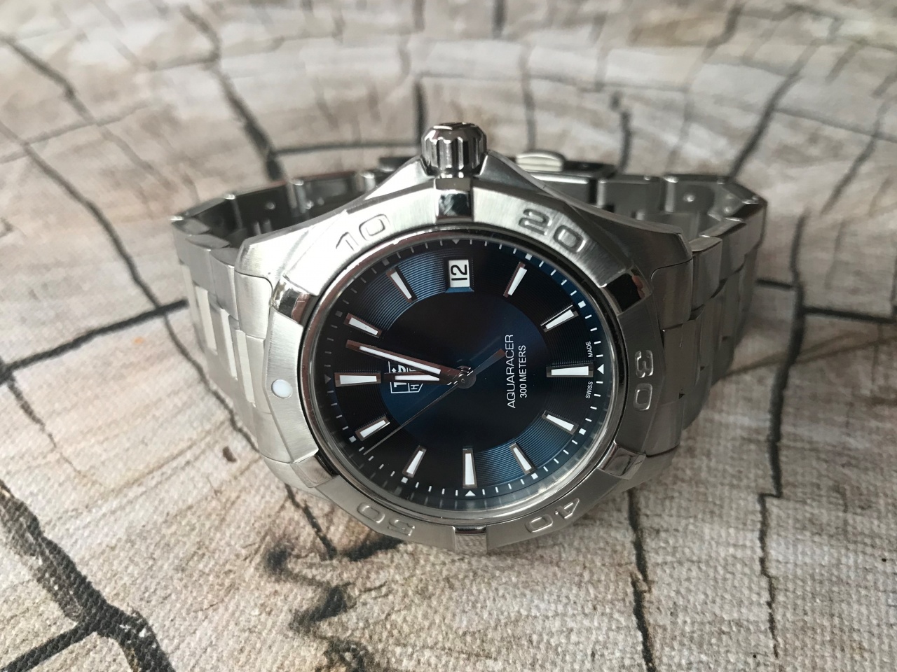 В наличии популярный дайвер TAG Heuer Aquaracer WAP1112.BA0831 в отличном состоянии. На корпусе и браслете присутствуют естественные следы эксплуатации, стекло в идеале. В комплекте: часы, чехол, инструкция, гарантийная карта. Очень классные часы на каждый день, практически под любой стиль одежды.