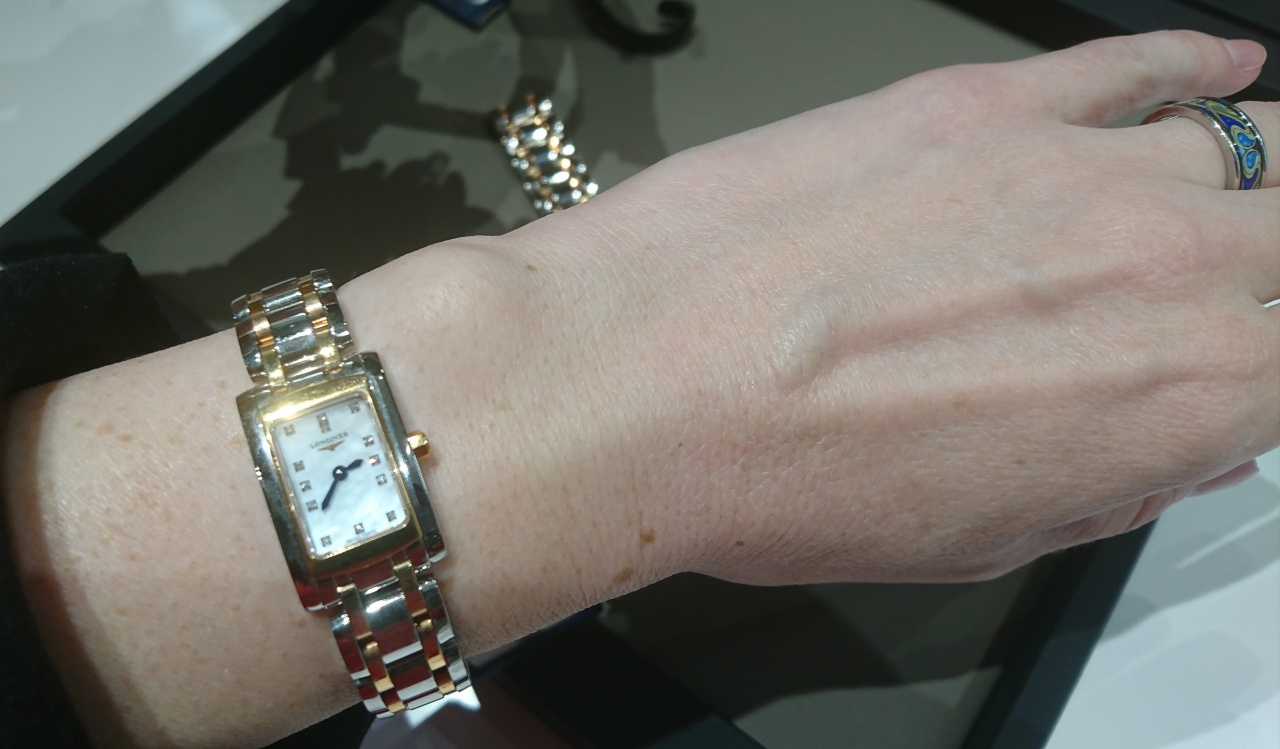 Ради интереса в ближайшем салоне примерила Лонжины из наличия, два маленьких (ПримаЛуна 23 мм и Дольче Вита) - маловаьы, если только как браслет, большая Дольче Вита (велики, по длинной стороне 42мм),и ПримаЛуна 27,но с излишним количеством бриллиантов. Наверное, лучше какая-то Дольче Вита среднего размера.