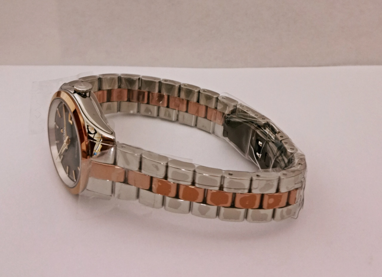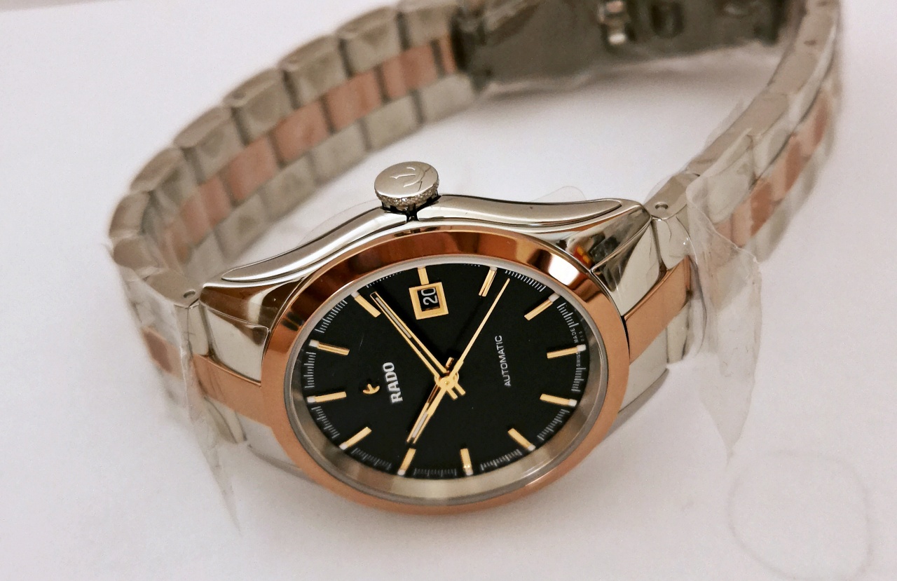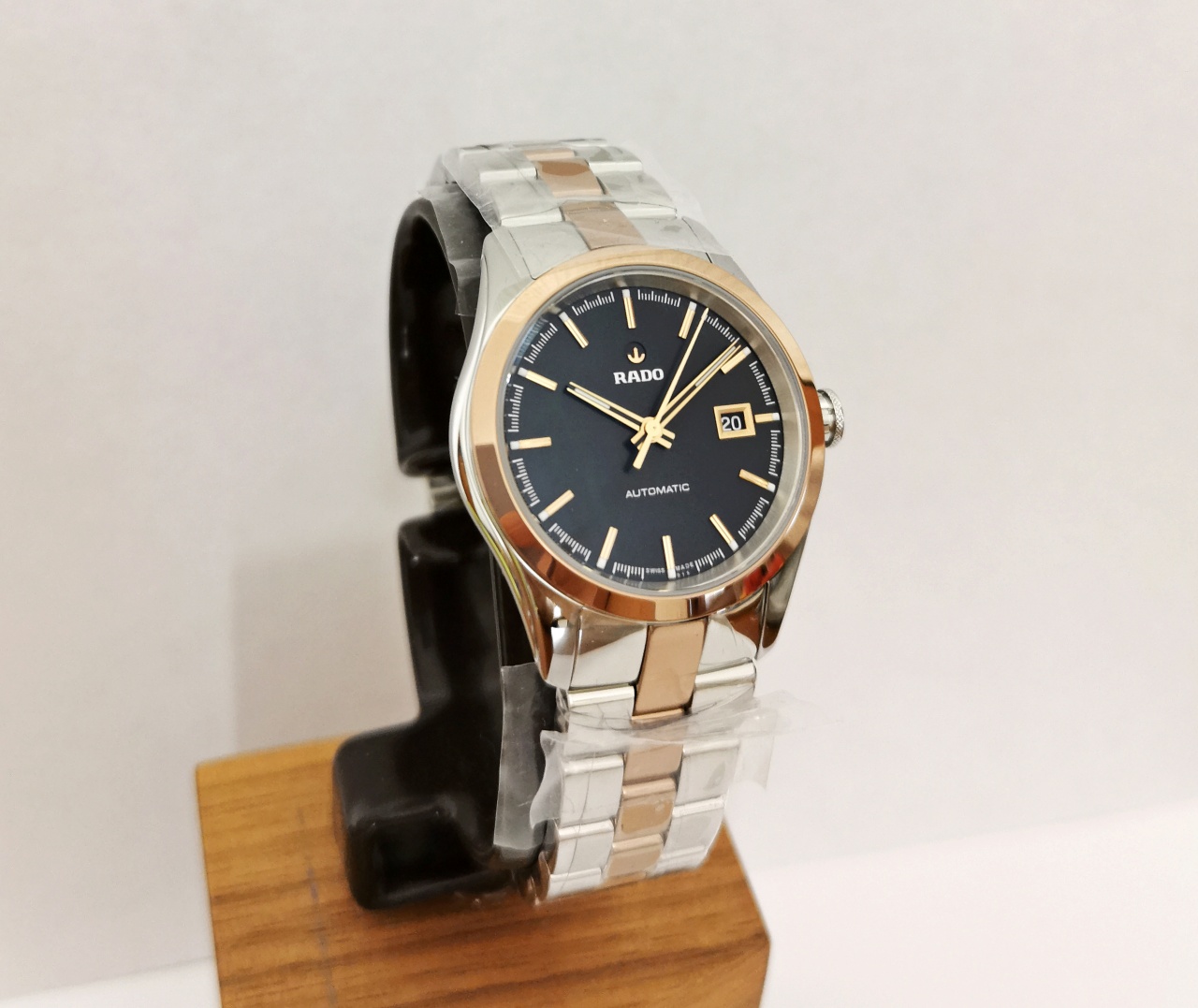 В продаже шикарная и очень красивая модель женских часов Rado коллекции HyperChrome, которая имеет корпус размера 32 мм выполненный из нержавеющей стали и керамики цвета: розовое золото, защищенным сапфировым стеклом с антибликом. Прозрачная задняя крышка корпуса. Часовая шкала с накладными метками. Стрелки золотистые с покрытием SuperLuminova. Браслет состоит из нержавеющей стали и высокотехнологичной керамики. Титановая застежка с системой блокировки и кнопкой. Водозащита: 50 м (WR 50). Автоматический швейцарский механизм. Производство: Швейцария. Цена в магазине: 170 000 рублей .