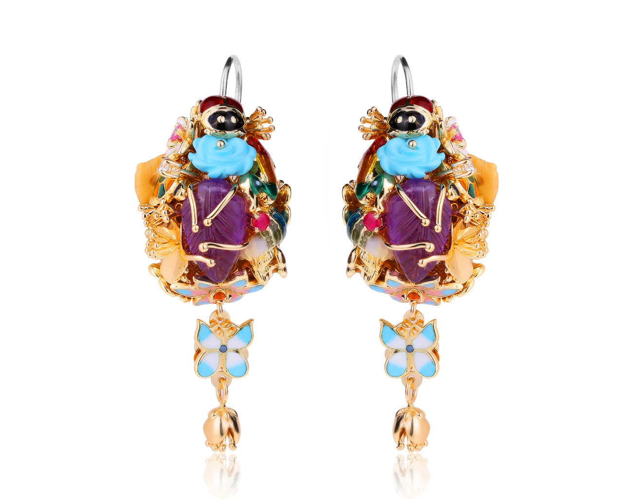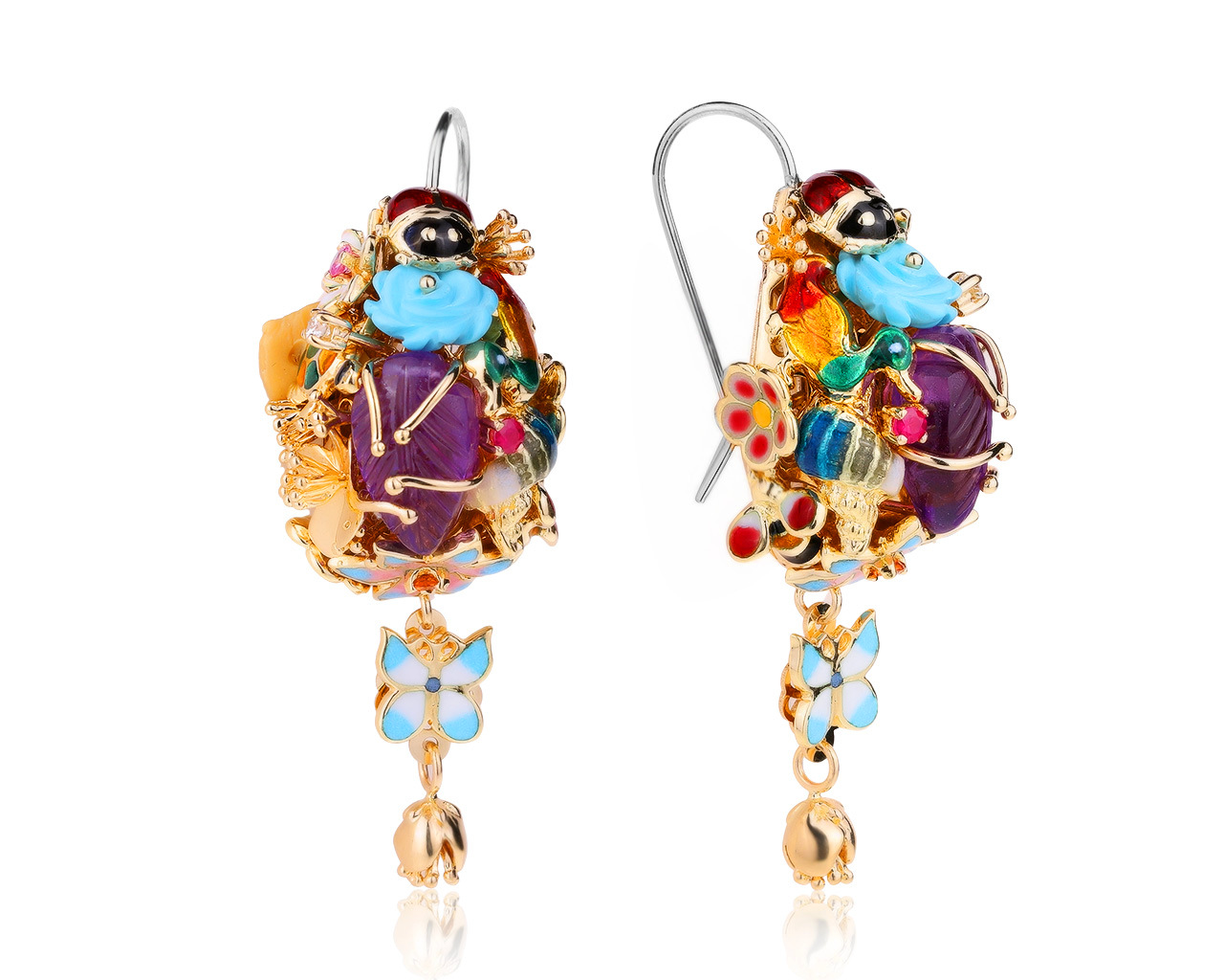 Представляем вашему вниманию оригинальные золотые серьги с эмалью, бирюзой, аметистами, бриллиантами 0.07ct, розовыми сапфирами 0.10ct и цитринами 0.05ct от всемирно известного бренда Roberto Bravo.