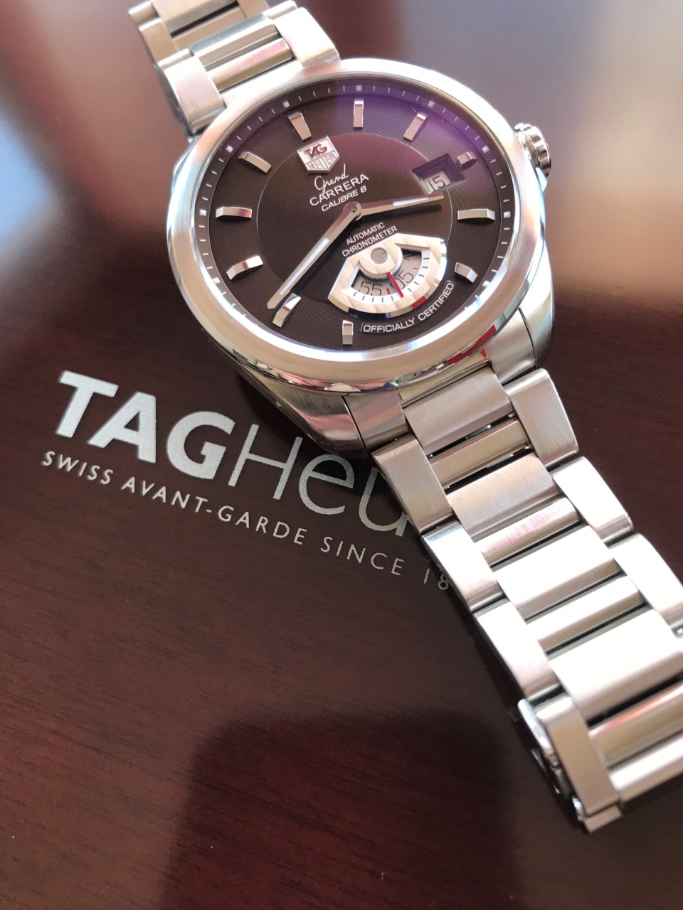 Циферблат: цвет шоколадный; гильоше, накладные метки, логотип; люм на стрелках и метках.