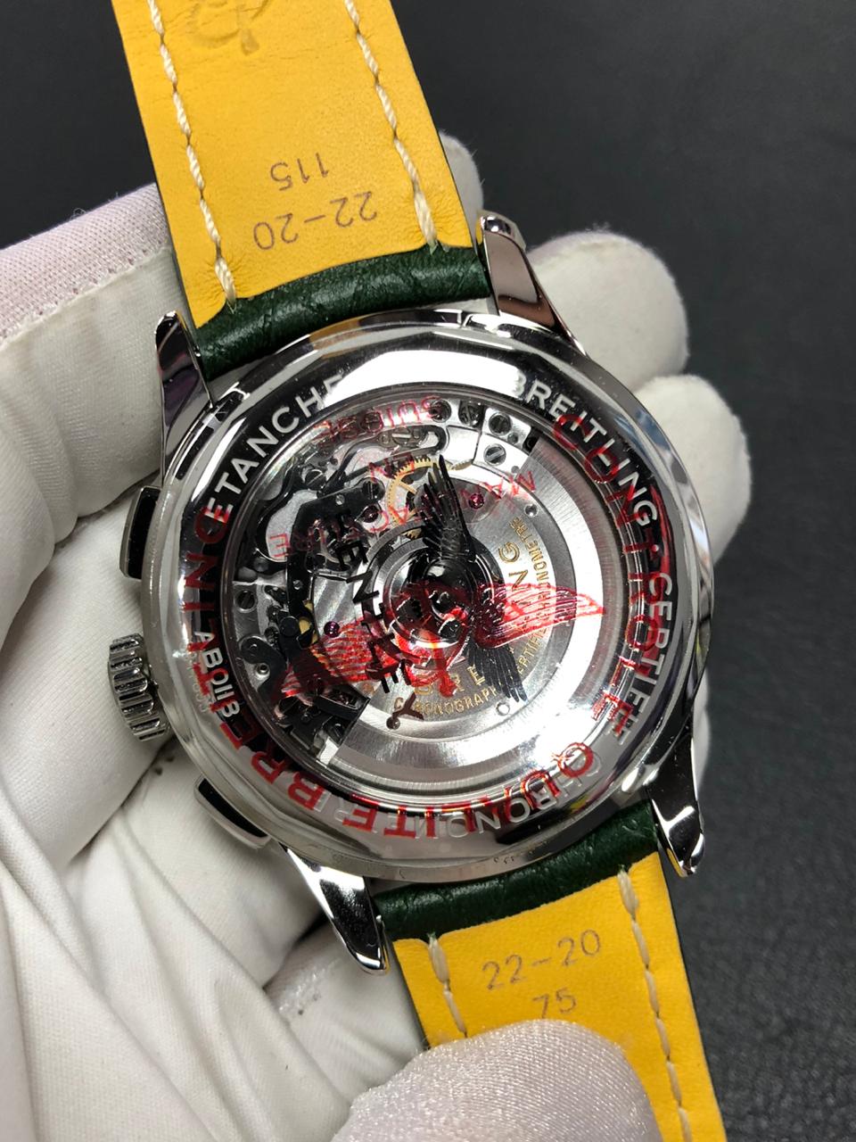 Швейцарский мануфактурный механизм с автоматическим заводом, калибр Breitling 01 является одним из первых созданных внутри компании. Запас хода составляет 70 часов, частота колебаний балансового колеса - 28 800 пк/час, 41 синтетический рубин в качестве камневых опор и палет анкерного спуска. Точность хода в соответствии сертификатом хронометра Swiss Official Chronometer Testing Institute. Погрешность точности хода каждого, индивидуально пронумерованного, механизма C.O.S.C. не должна превышать -4/+6 секунд в сутки и проверяется последовательно в 5 положениях на протяжении 15 суток при температуре: 8, 23 и 38°C. Функции: центральные часовая, минутная стрелки и маленький секундный указатель, индикация даты с возможностью коррекции, хронограф с колонным колесом, центральная секундная стрелка, индикатор на 30 минут.