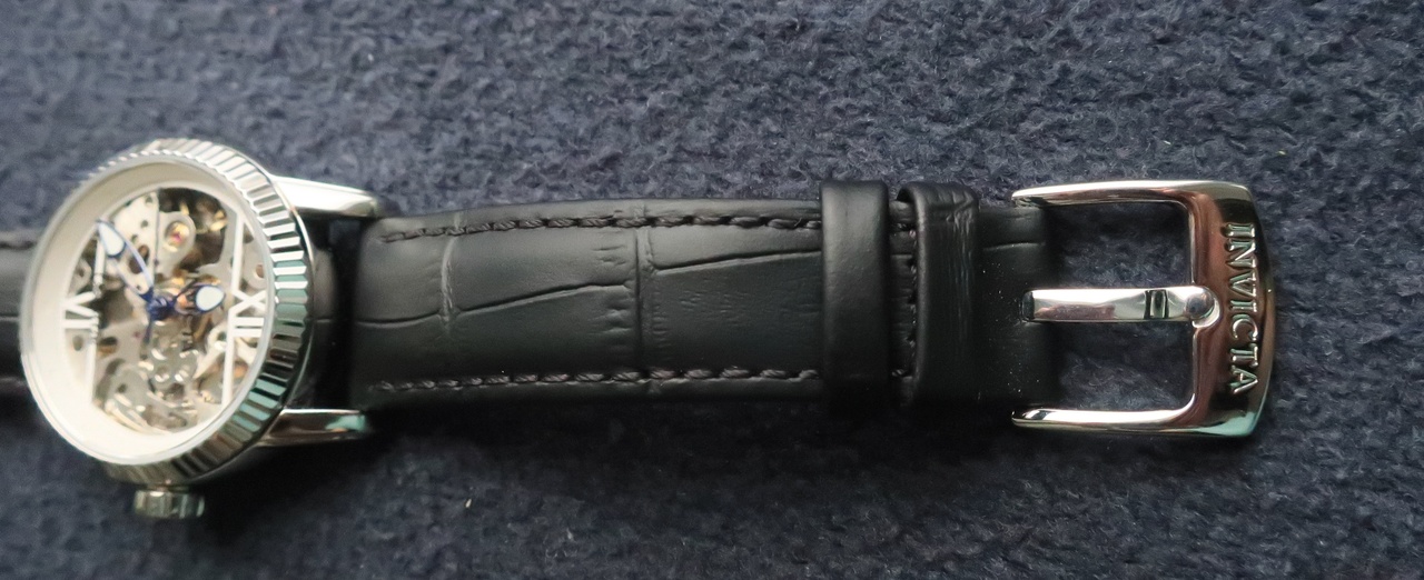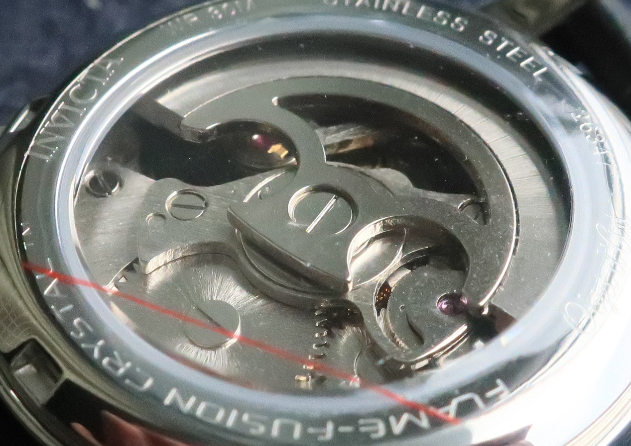 • Механизм — китайский PTS 2650 на 20 камнях. Насколько я понимаю, это “стандартный механизм”: потомок тех, кто разработали в 1970-х ради стандартизации часопрома в Китае (раньше многочисленные фабрики делали механизмы кто во что горазд). Говорят, “стандарты” не блещут точностью, зато надежны — если сделаны не “у дядюшки Ляо”, а на заводе. Для Invicta механизмы поставляют с проверенных заводов, и проблем быть не должно.