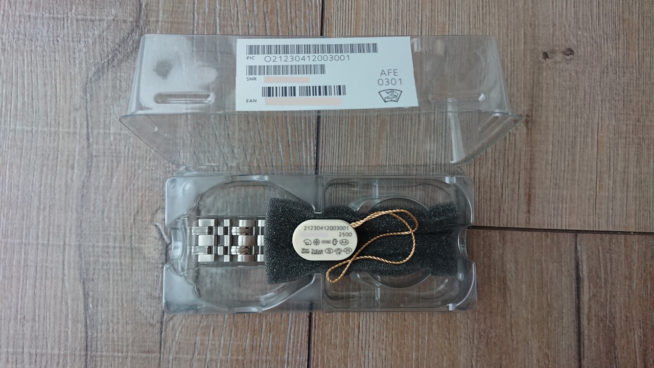 Полный комплект: запасные звенья браслета, гарантийная карта, карта с пиктограммами, чехол для карт, инструкция, большая деревянная шкатулка, две коробки.