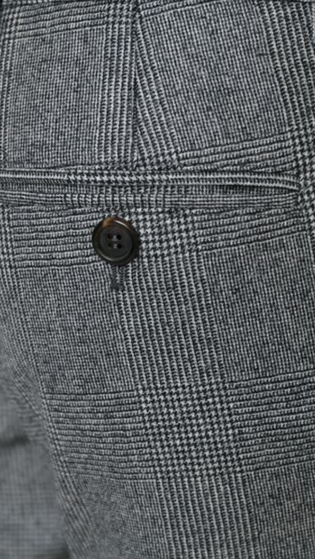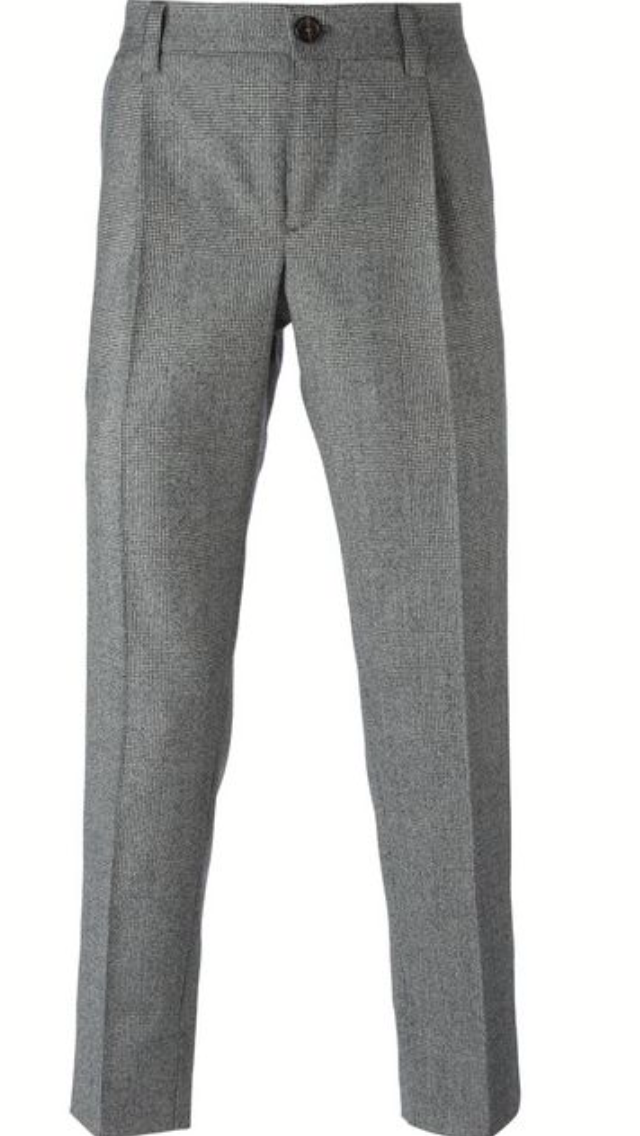 В продаже,новые мужские классические брюки,кроя slim,от известной итальянской марки BRUNELLO CUCINELLI.Модель,выполненная в серых тонах,характеризуется сочетанием натуральных изысканных волокон шерсти и традиционного кроя.Мягкая ткань украшена клетчатым узором "Prince of Wales".Образ дополняют прорезные карманы по бокам и сзади.