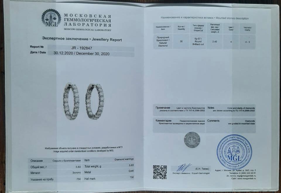 Серьги-кольца с бриллиантами 2,40 карат (аттестат МГЛ)!