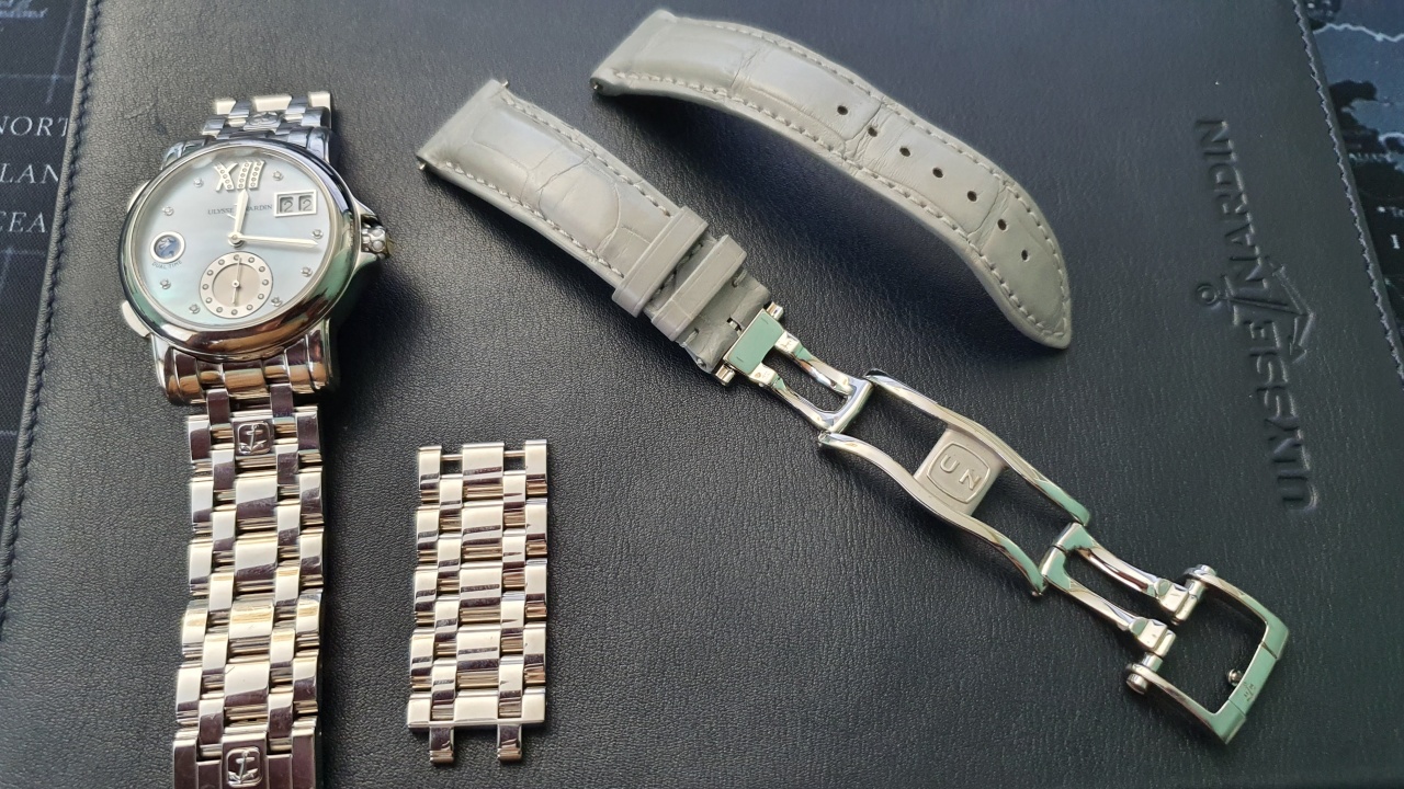 В комплекте: коробка, документы и абсолютно новый оригинальный серый ремешок из кожи аллигатора с застежкой.