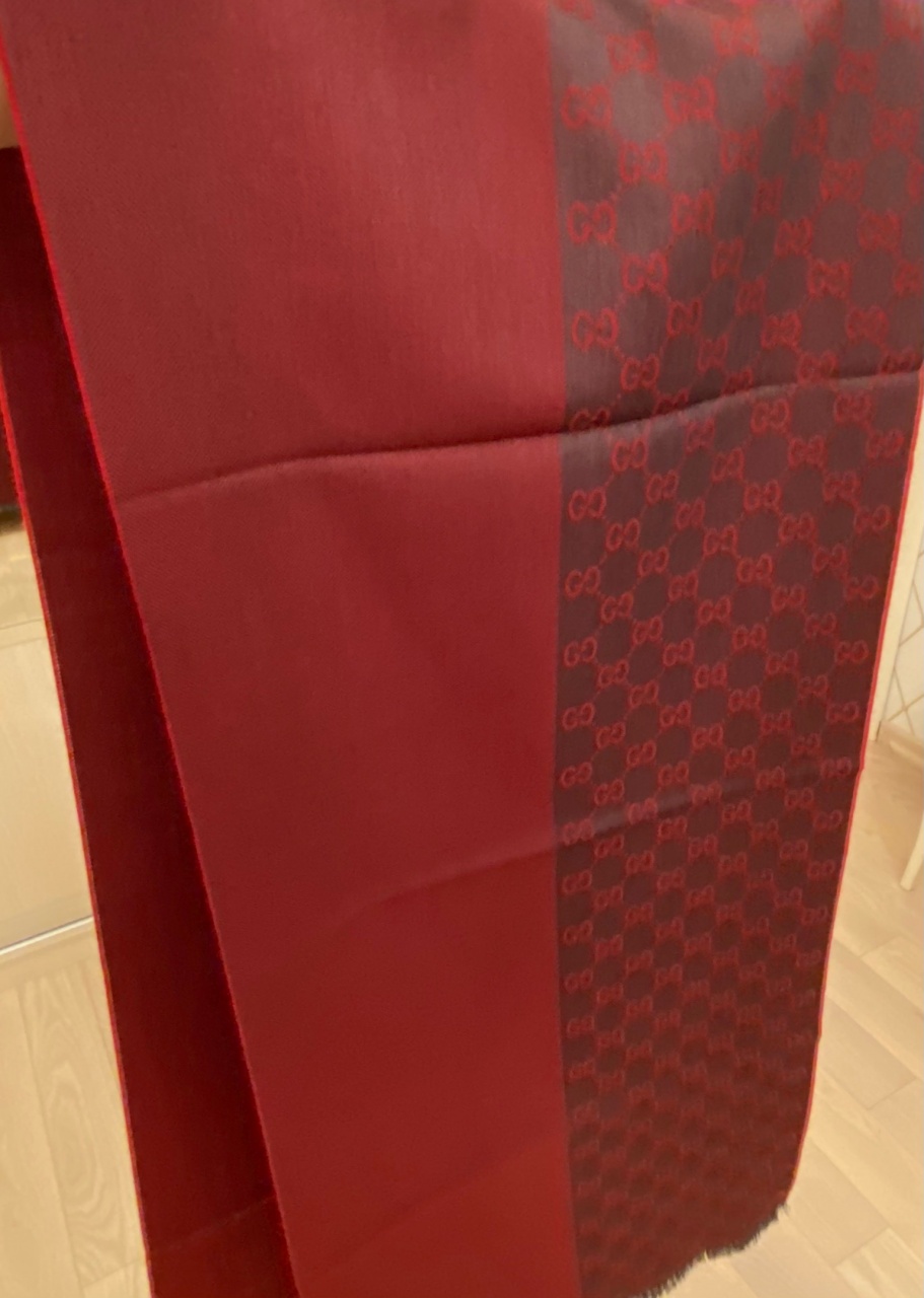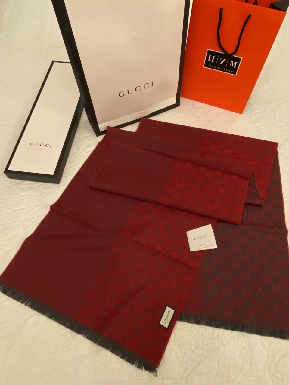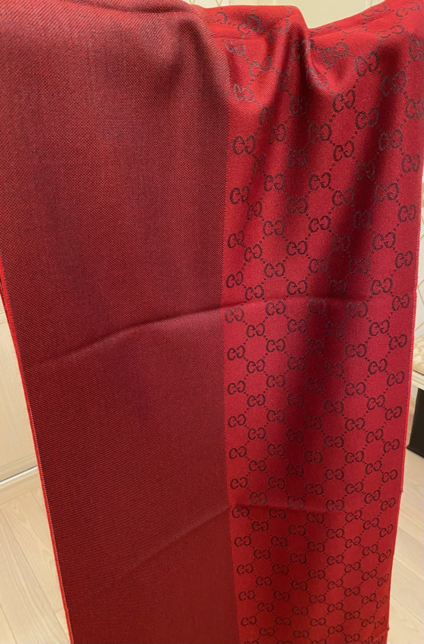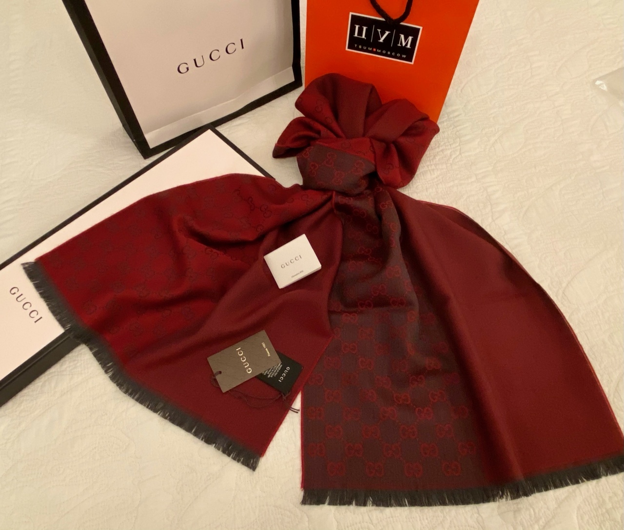 Роскошные цвета - терракотовый в сочетании с темно-серым, рисунок Signature GG методом интарсии (двустороннее наложение рисунков). Размер оптимальный - 40 на 180 см, мягкая и теплая мериносовая шерсть 100%. Тонкая 2см бахрома на концах. Все бирки и ярлыки на изделии.