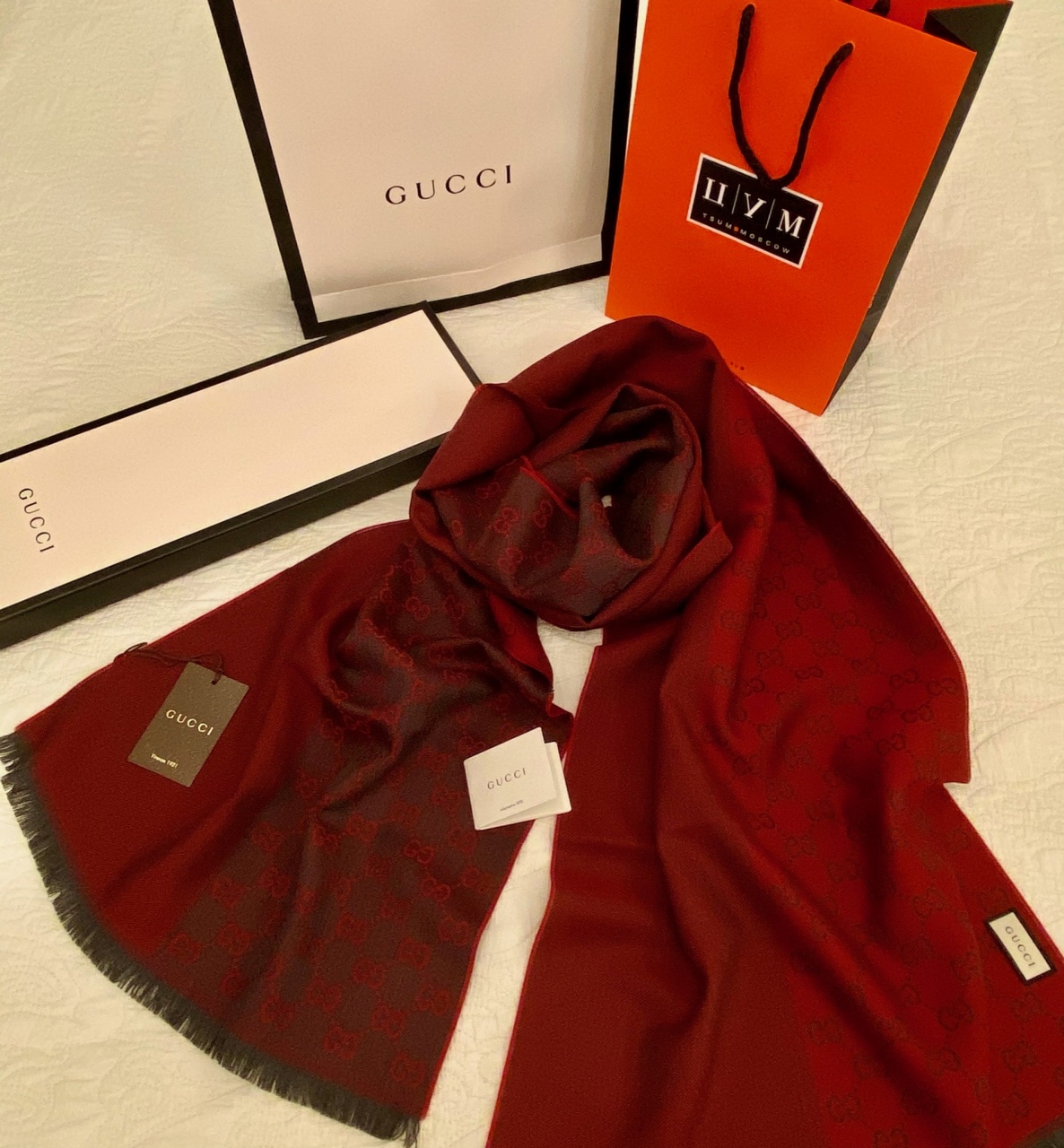GUCCI шарф мужской. Новый. 100% мериносовая шерсть. Рисунок Signature GG. Цвет терракотовый с темно-серым рисунком
