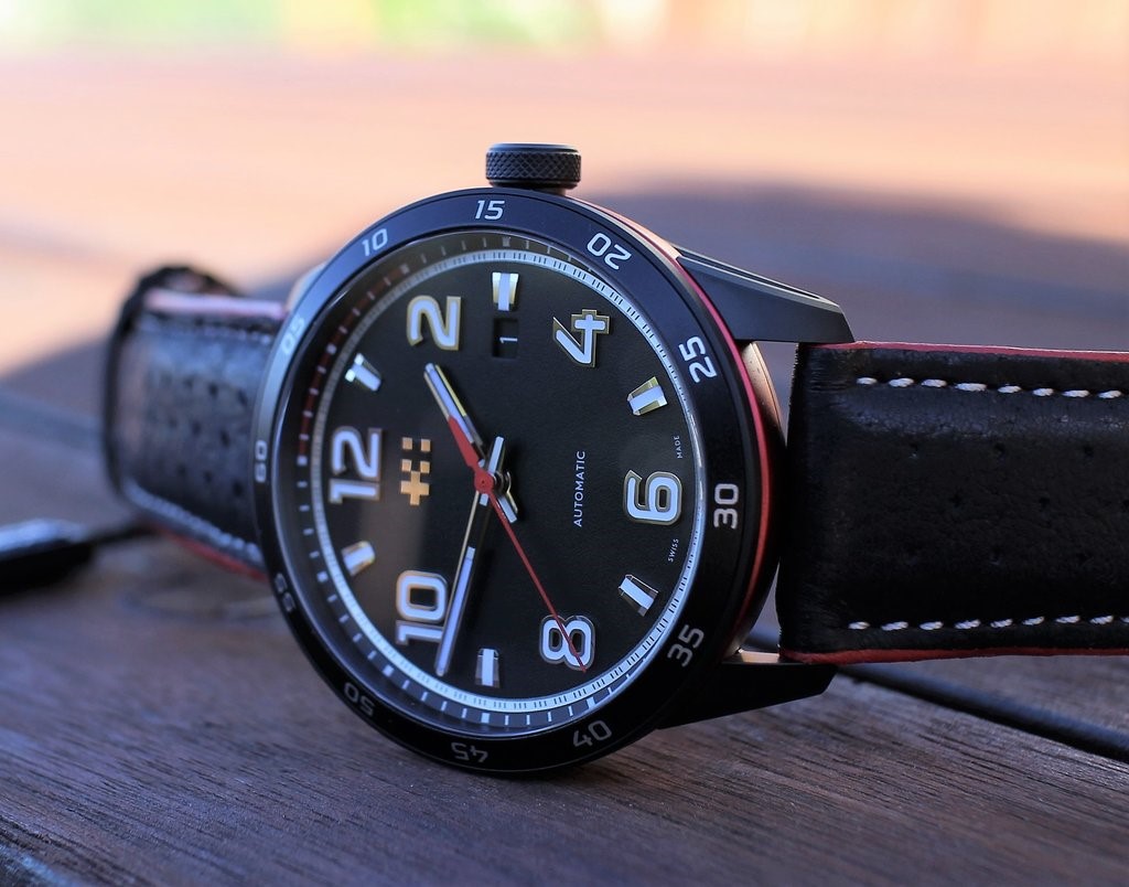- Корпус: Нержавеющая сталь 316L двухцветный – черный/красный с прочным DLC покрытием, устойчивое к царапинам. Завинчивающаяся задняя крышка с выгравированным логотипом и информацией о часах. Завинчивающаяся заводная головка.