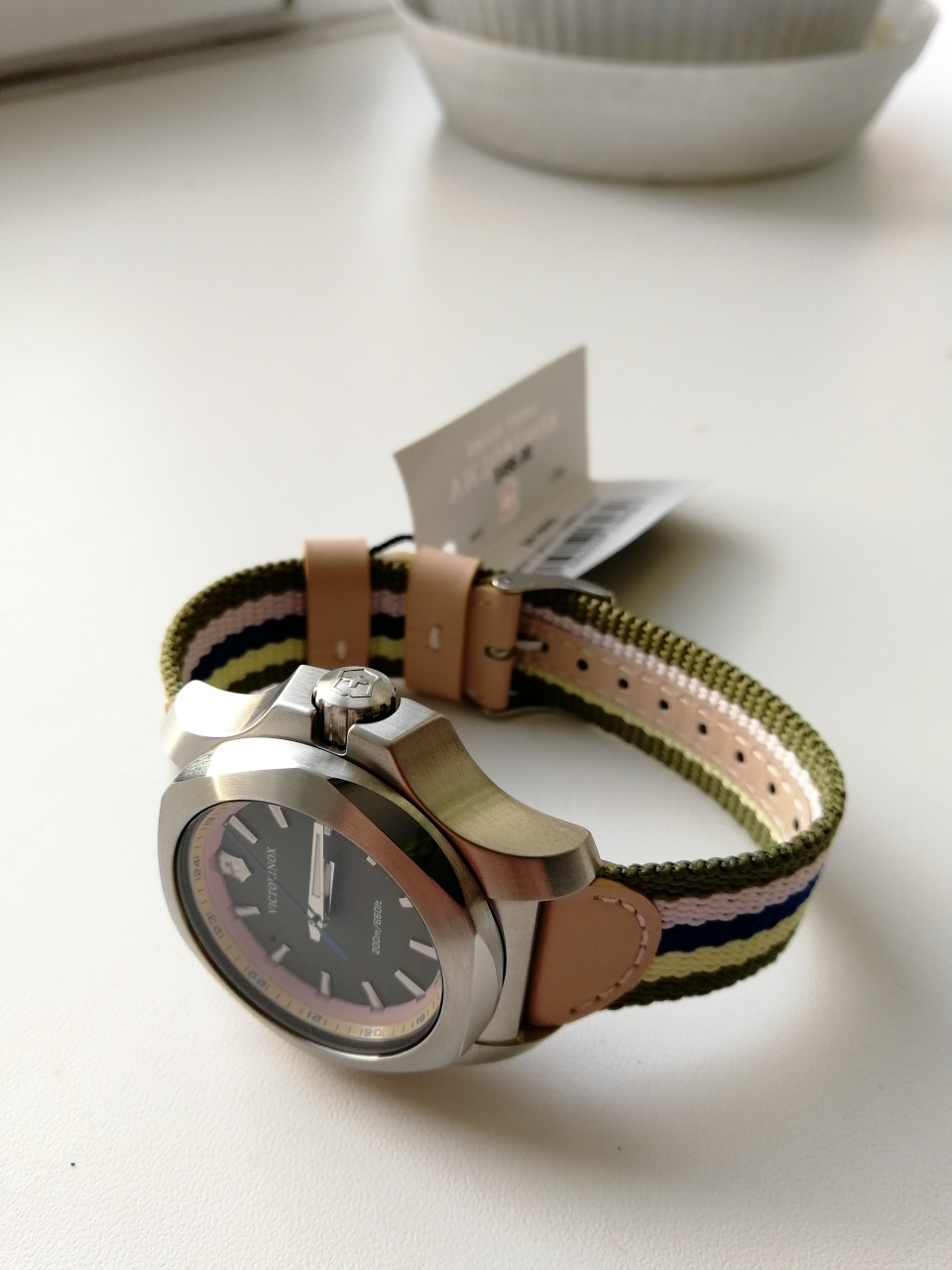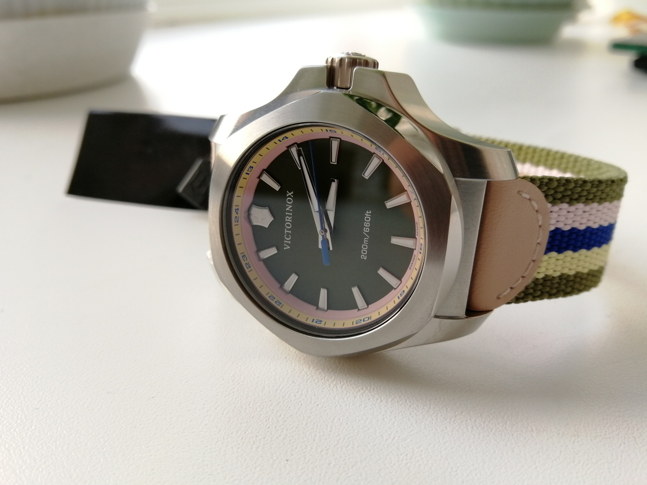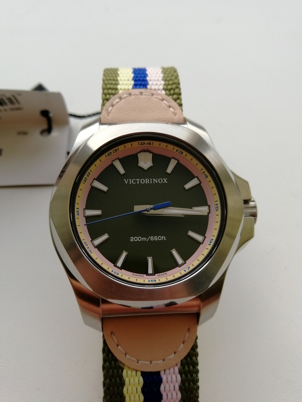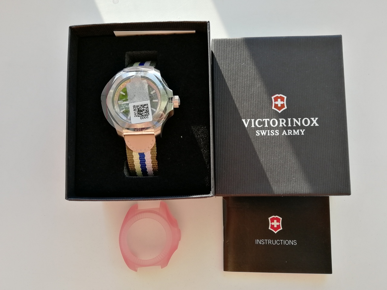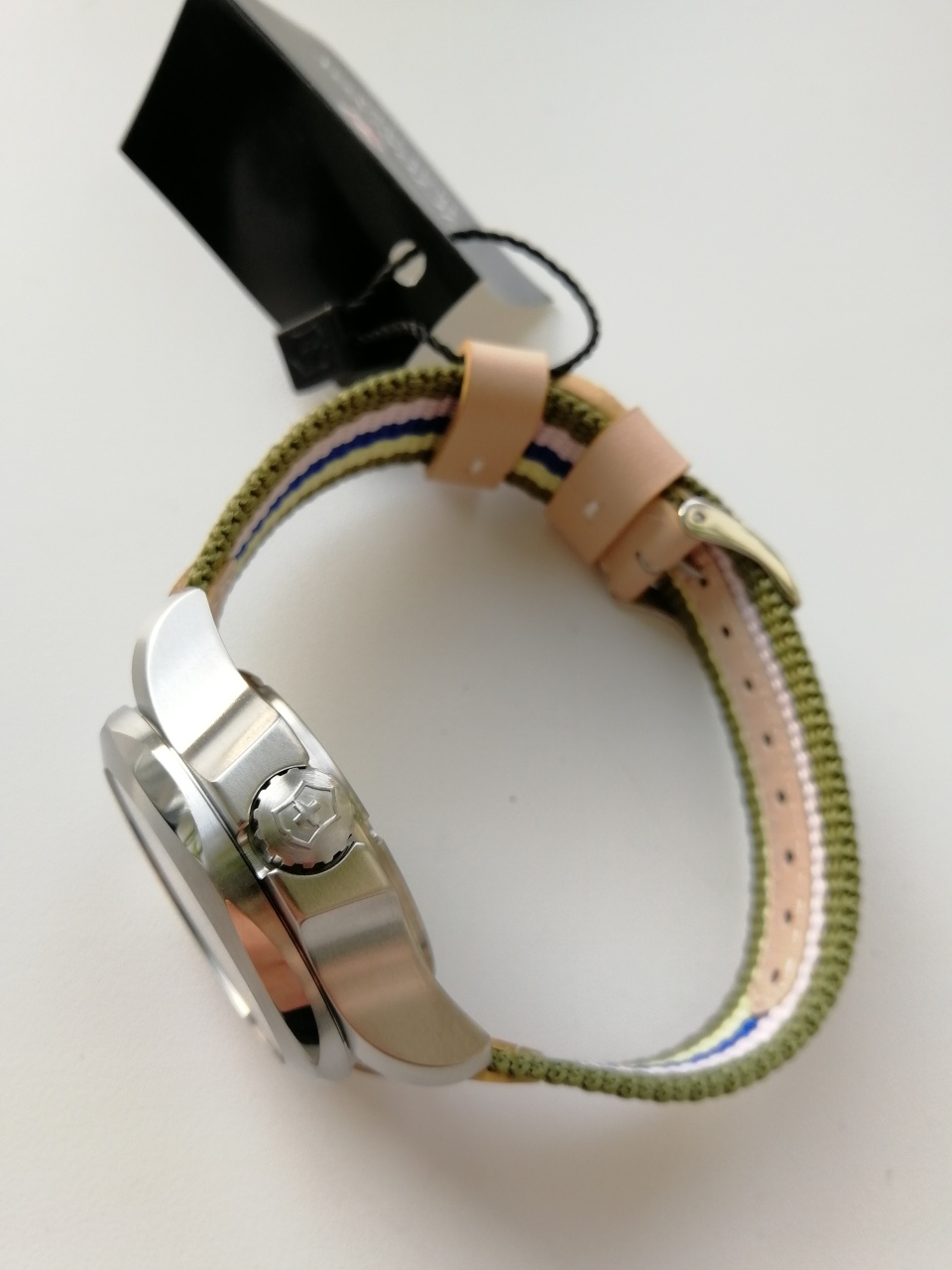 В продаже женская версия INOX! Одни из самых прочных и супернадежных часов в мире теперь и в женском варианте. Часы для активных и уверенных в себе людей. Детально проработанный цифер зеленого цвета с розовым и желтым обрамлением, шикарный комбинированный ремешок из кожи и ткани, отличный люм. Безупречное качество полировки, свойственное всем моделям Victorinox. В общем, все полезности мужских INOX в нежном дамском исполнении. В комплекте защитный бампер розового цвета. Вживую часы смотрятся намного интереснее и богаче чем на фото.