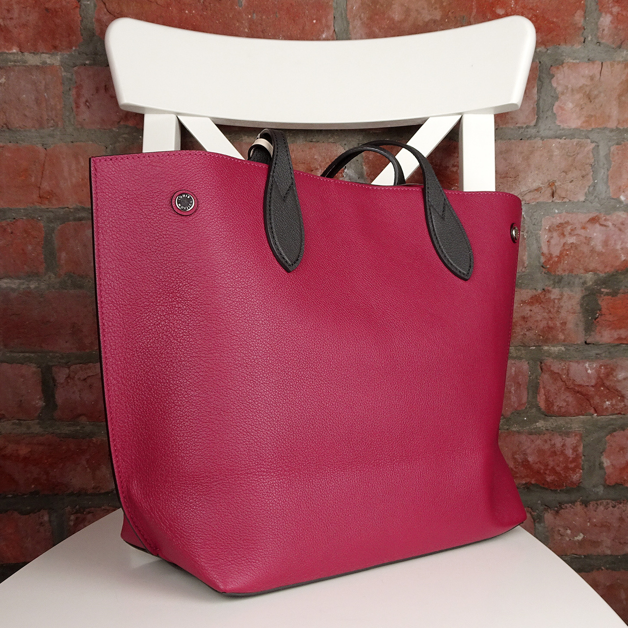 Важное отличие модели от других сумок в стиле Neverfull (которые часто делаются полностью открытыми) - эта сумка закрывается: имеет поворотный замок-застежку по центру и две застежки-кнопки по бокам.