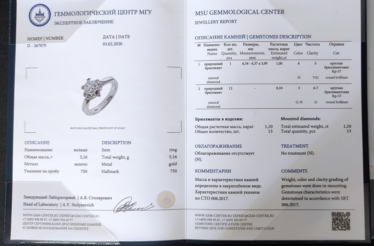 Кольцо с бриллиантом 1.00ct "Звезда Млечного пути" (Сертификат МГЦ)