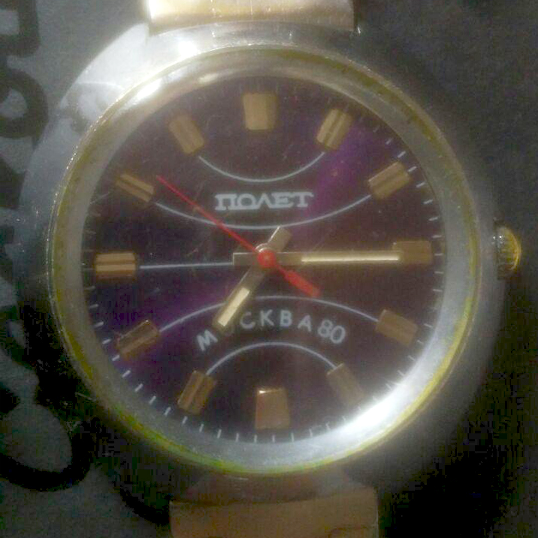 2) Полёт - Москва 80. Смущает что на корпусе нет выреза в виде кольца чуть ниже стекла, вроде бы в родном корпусе таких моделей он был - или это связанно с разными годами выпуска серий? Так же не ясно родная ли задняя крышка для данной модели с таким циферблатом, на ней изображен знак качества. А там где механизм вместо довольно часто встречающегося пластмассового кольца держателя механизма стоит металлическое.