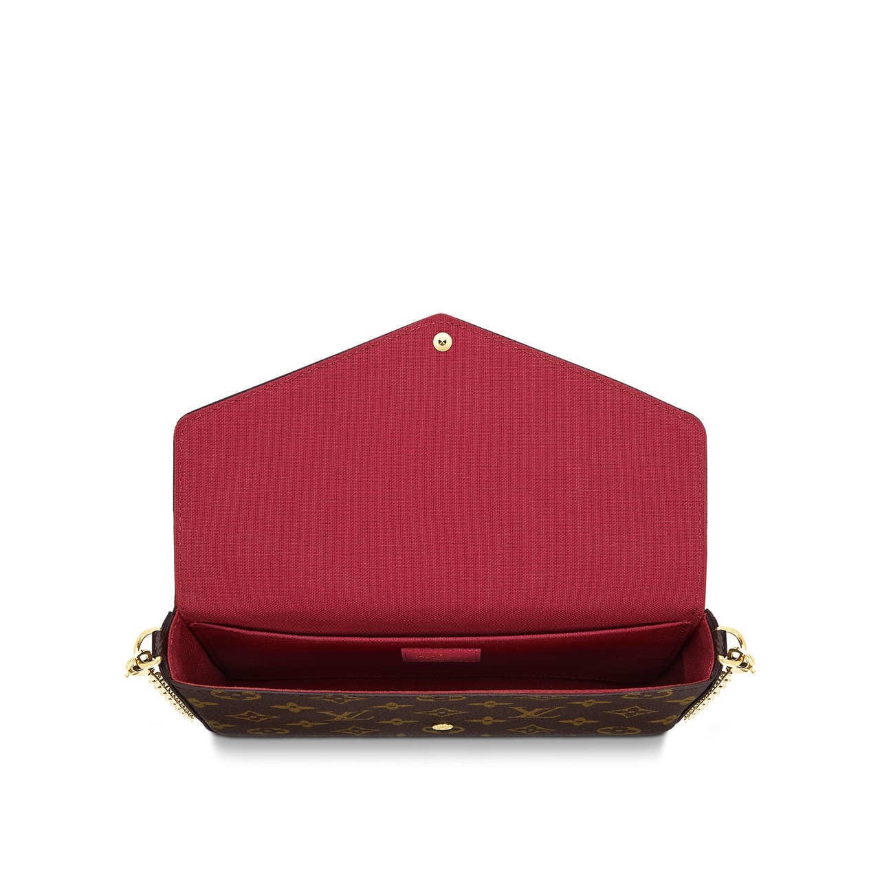 "Компактная модель Felicie из культовой канвы Monogram - идеальное решение для хранения самого необходимого. Изысканный дизайн в форме конверта дополнен двумя съёмными внутренними отделениями. Два отделения, одно из которых закрывается на молнию, а второе имеет отделения для банковских карт, придают дизайну исключительную функциональность. Благодаря съёмному ремню-цепочке золотистого цвета универсальный аксессуар украсит образ в качестве клатча или модели на плечо."