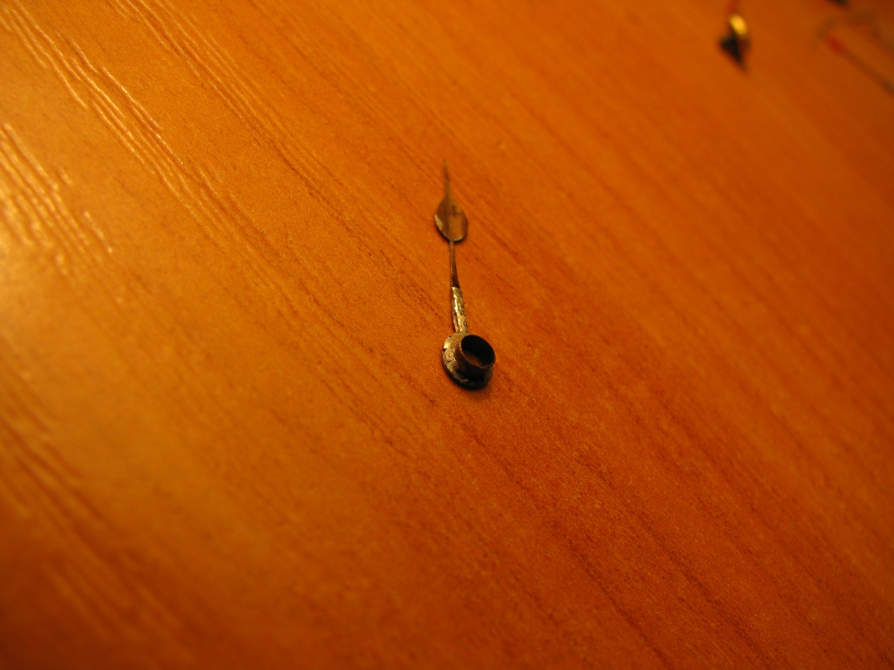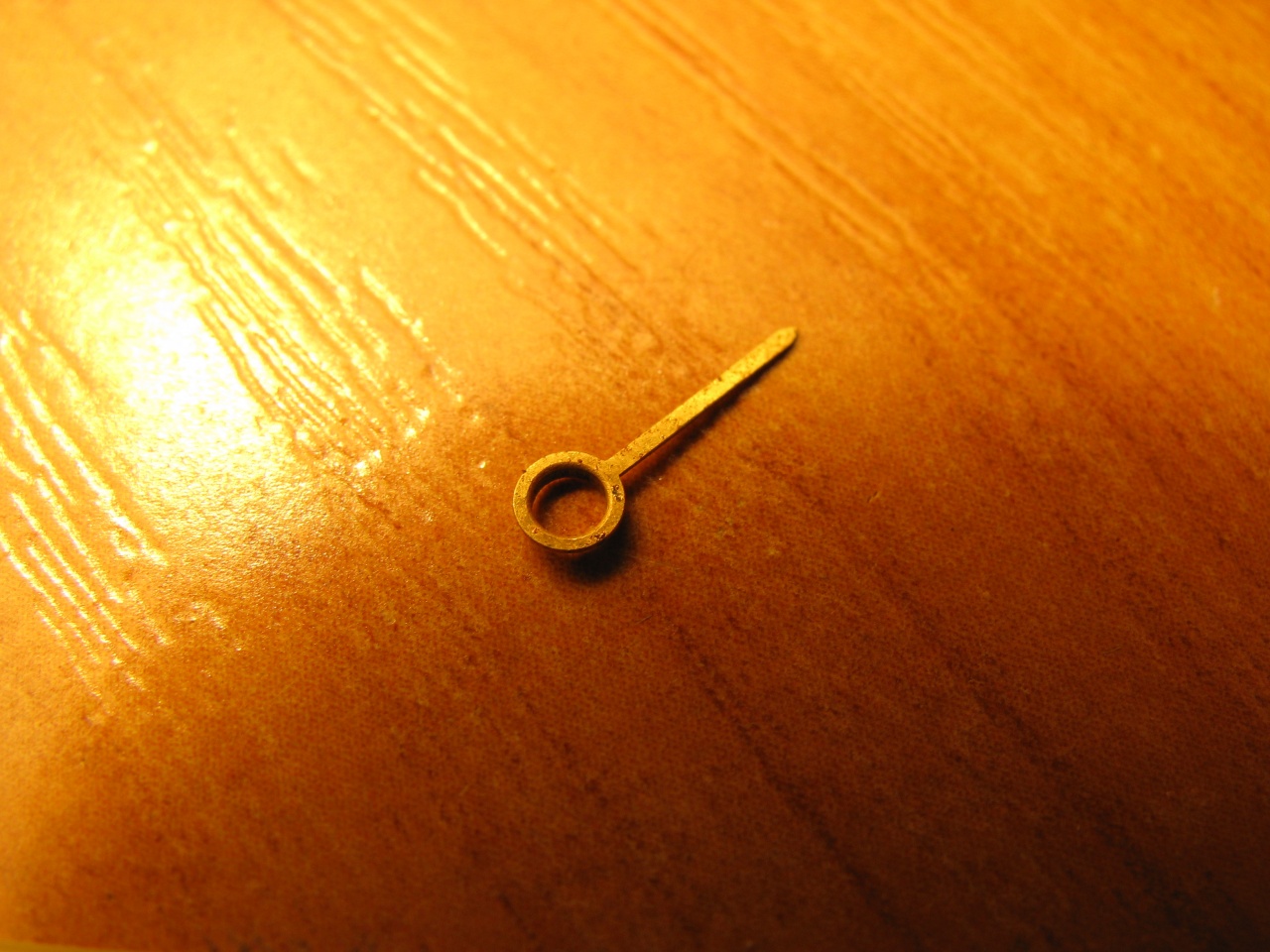 здравствуйте. хочу поделиться опытом ремонта часовой стрелки на карманных часах. стрелка была отломана в наиболее хрупком месте - у самого основания ( большой градиент ширины ). пришла в голову идея припаять на тонкую пластину. за основу взял слегка покрытую коррозией ( чтоб не жалко было ) часовую стрелку от Poljot de luxe automatic ( вечная ей память ), у сей модели широкий часовой триб и одновременно тонкая прочная стальная стрелка. сначала сточил на точиле трубочку, чтоб стрелка стала плоской. потом на том же точиле убрал половину окружности. часовой триб карманника оказался всё же шире Полёта, поэтому пришлось остаток отверстия доточить алмазным круглым надфием, так, чтоб при прикладывании к основанию поломанной стреки, ничего не выступало. облудив спаиваемые поверхности ортофосфорной кислотой, припаял сначала пластинку к основанию стрелки, потом аккуратно и само копьё ( так, чтоб не успел расплавиться припой у основания ). убрал квадратным надфилем остаток припоя и промыл в воде стрелку. основная проблема - следить, чтоб кислота не попала на воронёную внешнюю поверхность стрелки
