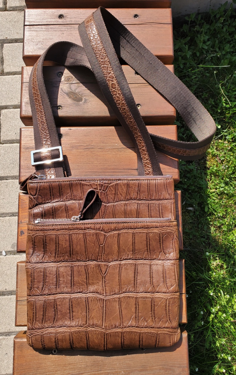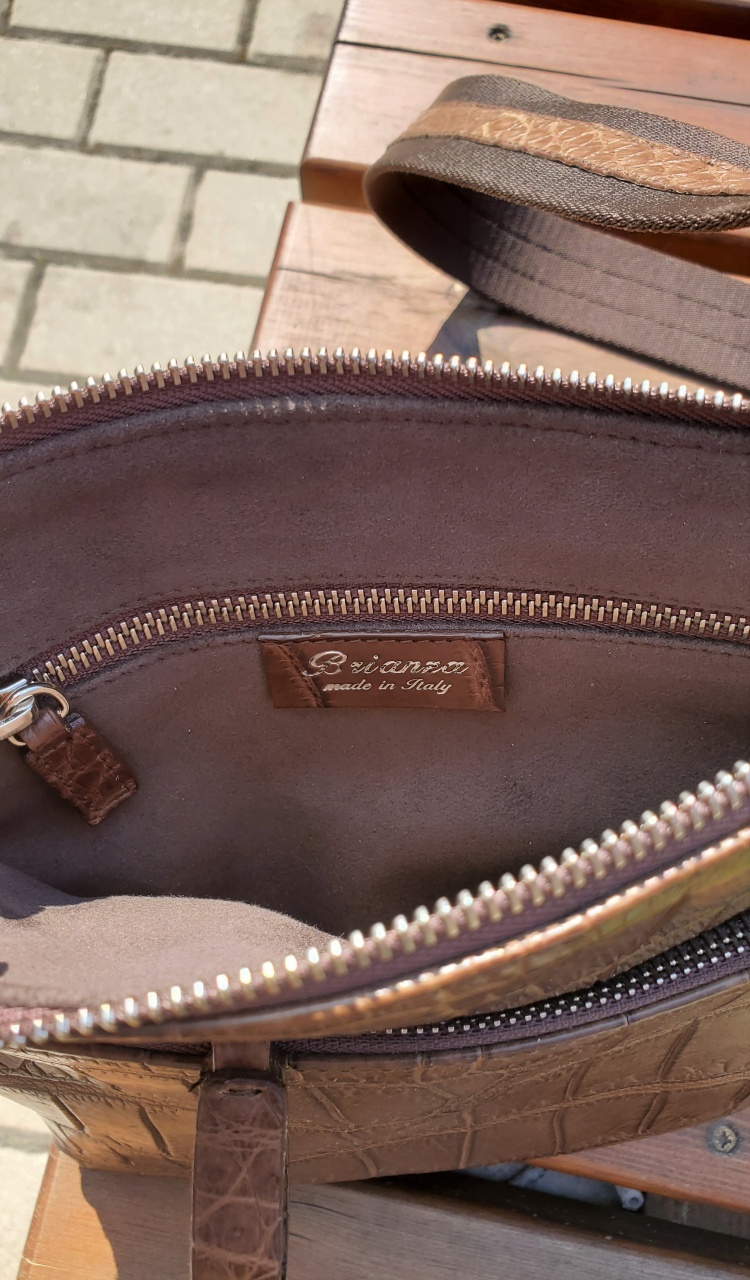 Внутри сумка изготовлена из мелковорсистой замши коричневого цвета с отделкой из кожи крокодила, и имеет одно большое отделение для переноски документов и прочих вещей, и дополнительное отделение на молнии.