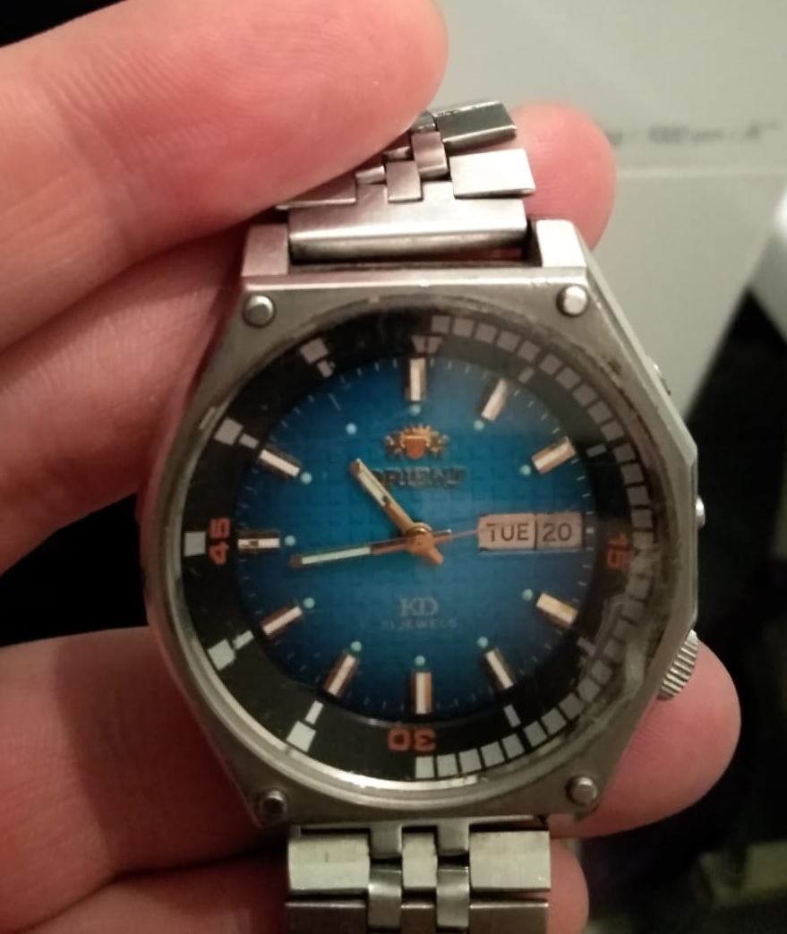 ORIENT SK со следами интенсивной эксплуатации. Резиновое кольцо под крышкой окаменело, но часы на уверенном ходу.