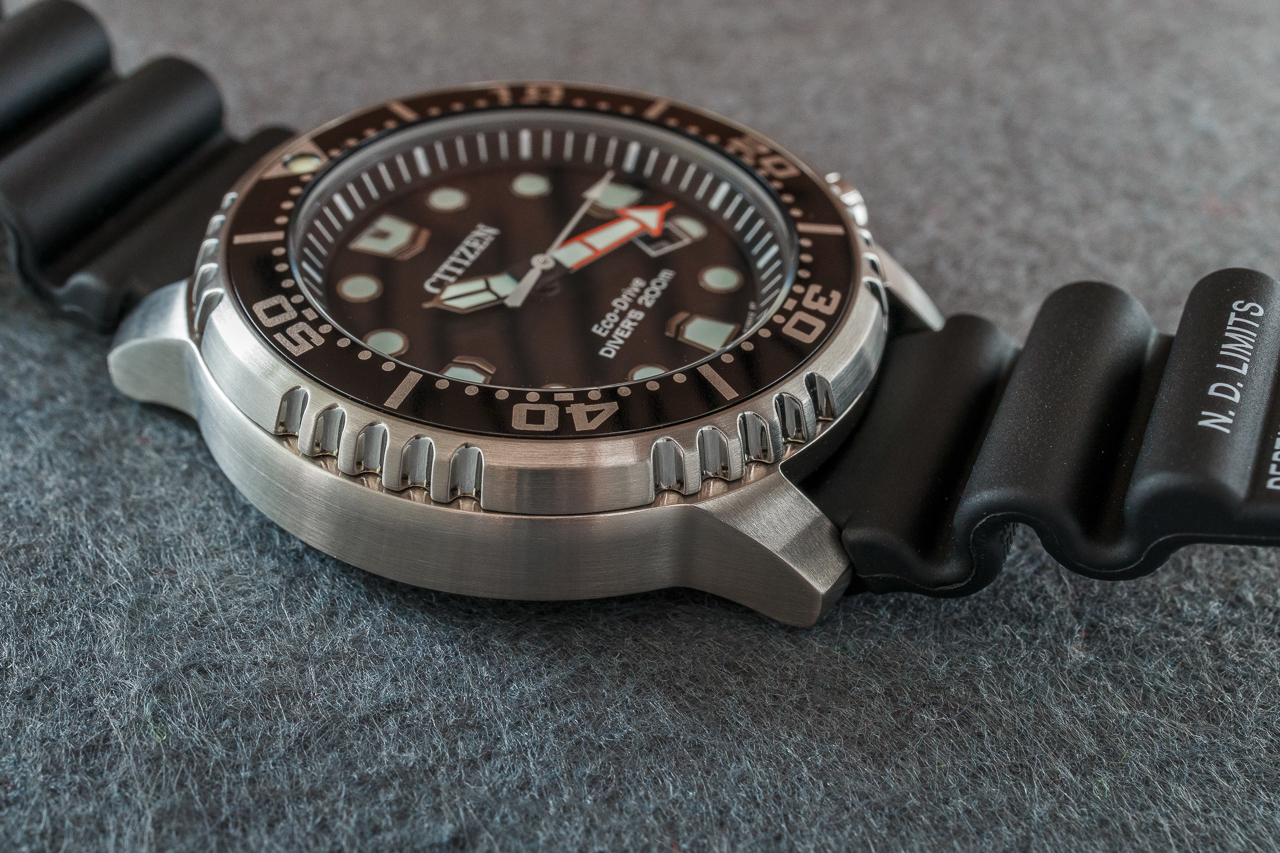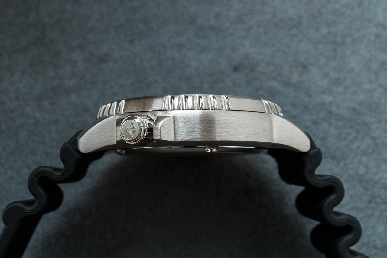 По отделке корпуса не могу сказать ничего особо хорошего. Все закрыто сатином - кроме прорезей в безеле, заводной головки и части задней крышки. С одной стороны - для утилитарных дайверов это неплохо, царапины будут видны минимально. С другой - хорошо посмотрев на часы выше уровнем в сравнении, сразу понимаешь - почему сатин настолько тотален. Почти все грани этой модели не блещут точной геометрией, часто имеют легкую кривизну и заваленность. К примеру, торцы ушек почти все - разные по форме. Также переход от ушек к корпусу - несколько разный.