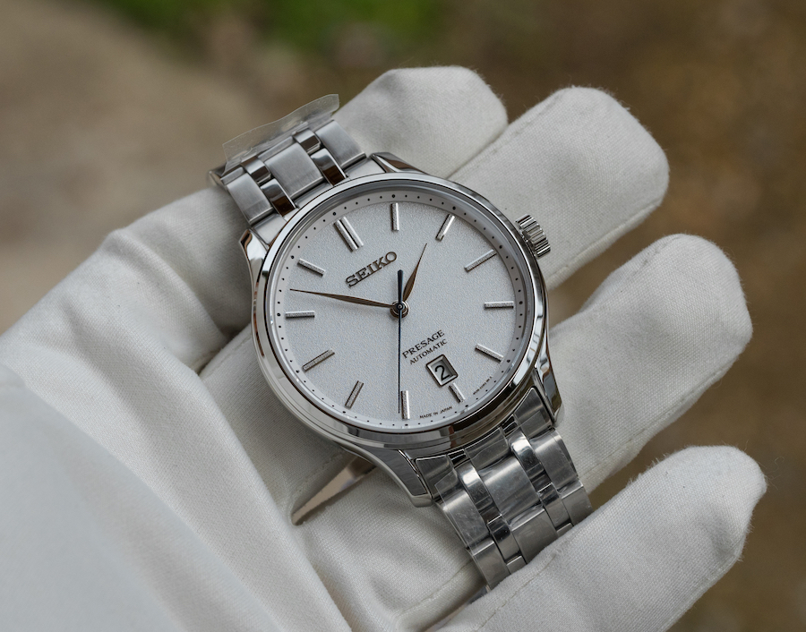 Свежая модель из престижной классической линейки Seiko Presage, смотрится очень красиво, снежный циферблат удался на славу!