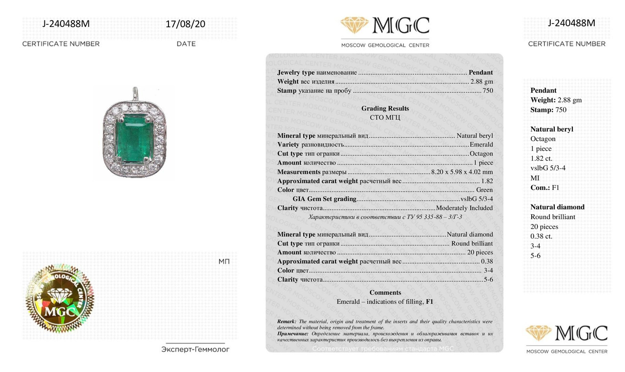 Подвеска из белого золота с изумрудом 1,82 карат и бриллиантами 0,38 карат (сертификат МГЦ)