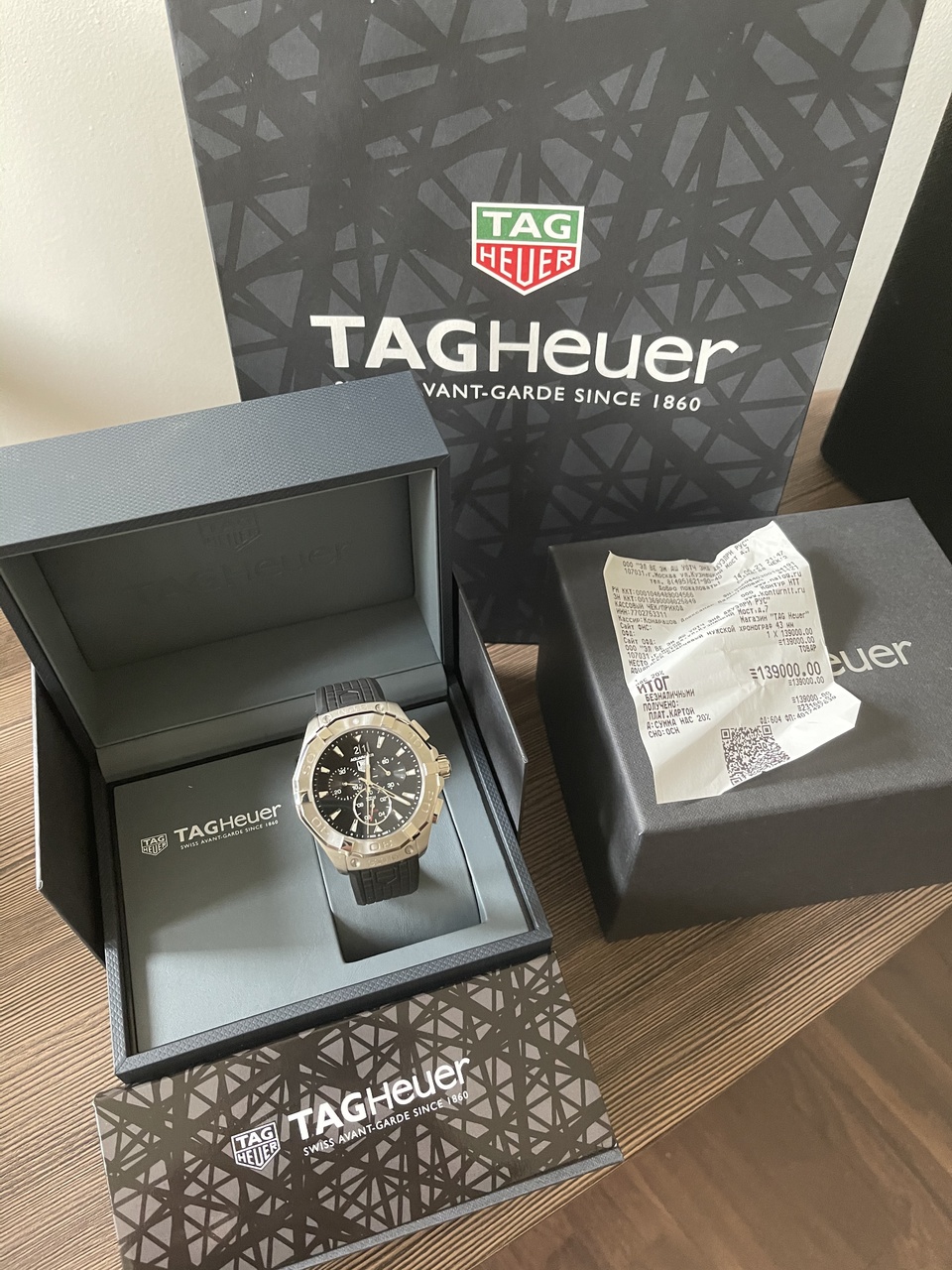 Друзья покупал эти часы меньше двух недель назад в бутике Tag Heuer на Кузнецком мосту за 139 000. Они абсолютно новые, помимо чека и коробки есть даже оригинальный пакет. Единственное, когда я их мерил, снял бирку, пока не могу ее найти.