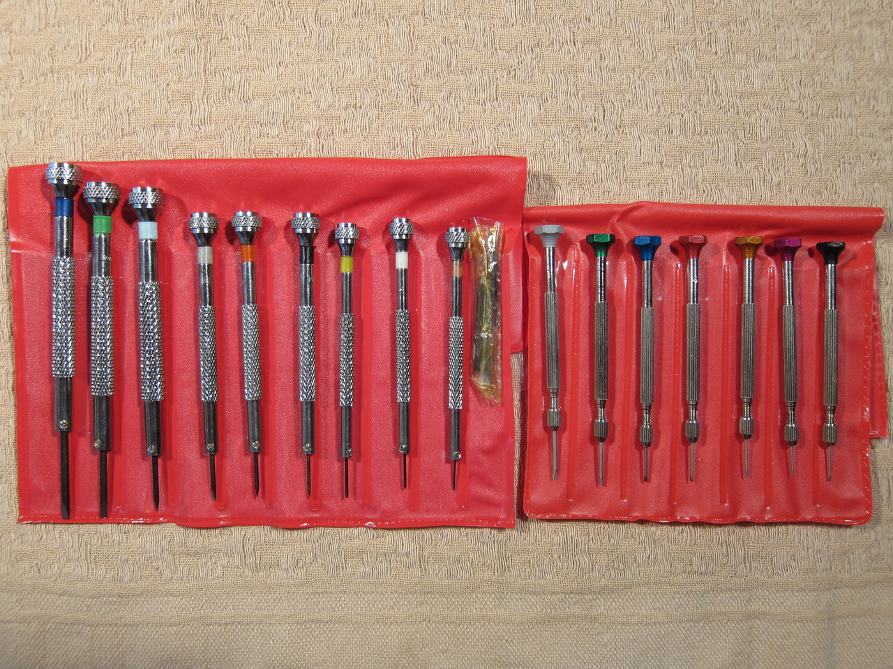 6. Набор часовых винтовых отверток 9 шт. - 700 р. (в наличие - 1 шт.) Диаметры жал - 2.3, 2, 1.6, 1.4, 1.2, 1, 0.9, 0.8, 0.6 мм. Рукоятки и пятки сделаны из никелированной латуни. В наборе 9 шт. отверток с запасными лезвиями и чехлом.