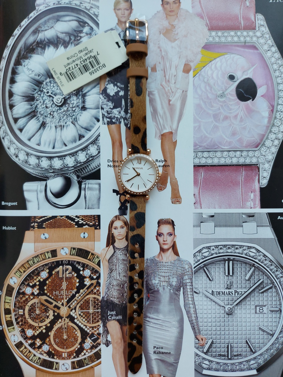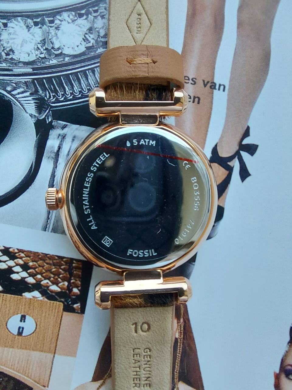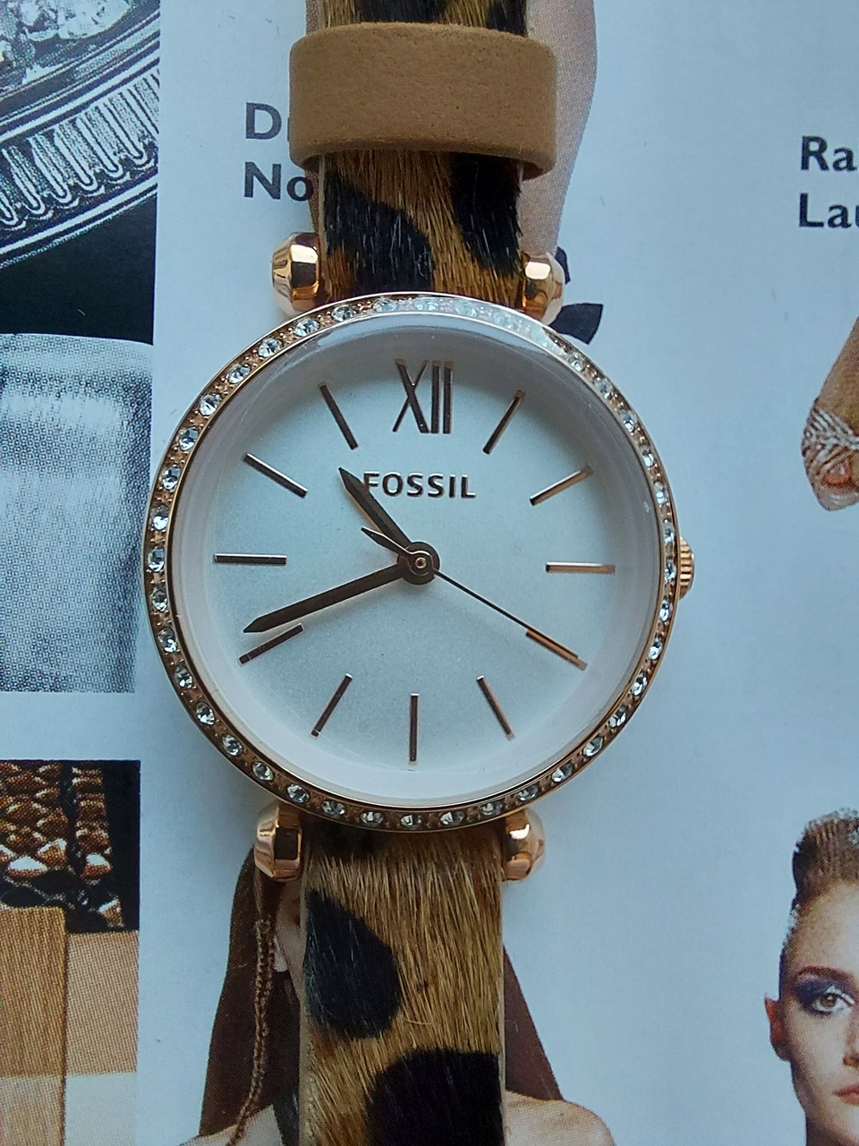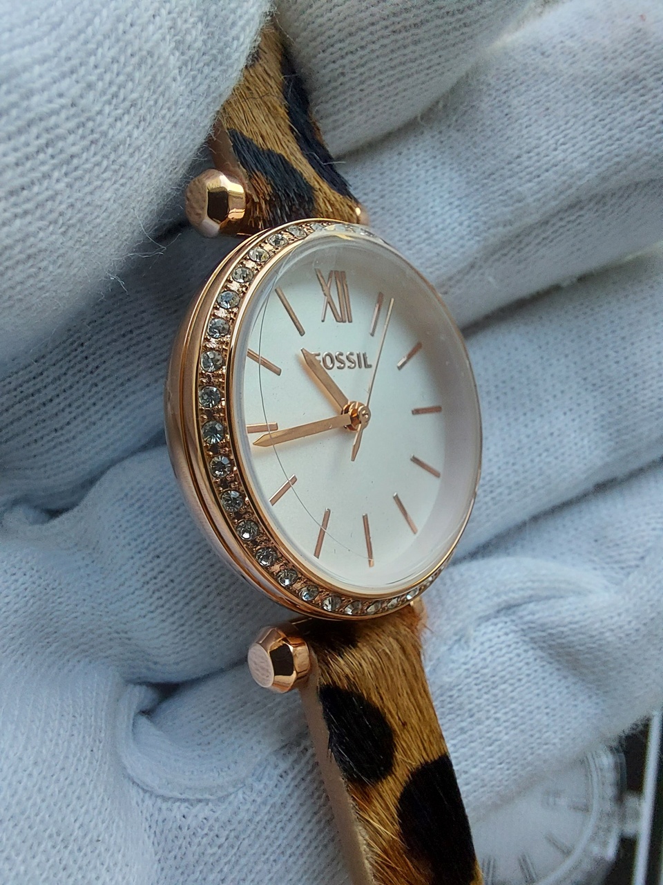 В ПРОДАЖЕ ЖЕНСКИЕ FOSSIL ИЗ НЕРЖАВЕЮЩЕЙ СТАЛИ ЦВЕТА РОЗОВОГО ЗОЛОТА С КОЖАНЫМ РЕМЕШКОМ С РИСУНКОМ ЛЕОПАРДА. ФИКСИРОВАННЫЙ БЕЗЕЛЬ ЦВЕТА РОЗОВОГО ЗОЛОТА С КРИСТАЛЛАМИ. СЕРЕБРЕННЫЙ ЦИФЕРБЛАТ СО СТРЕЛКАМИ ЦВЕТА РОЗОВОГО ЗОЛОТА И ИНДЕКСНЫМИ ЧАСОВЫМИ МЕТКАМИ.