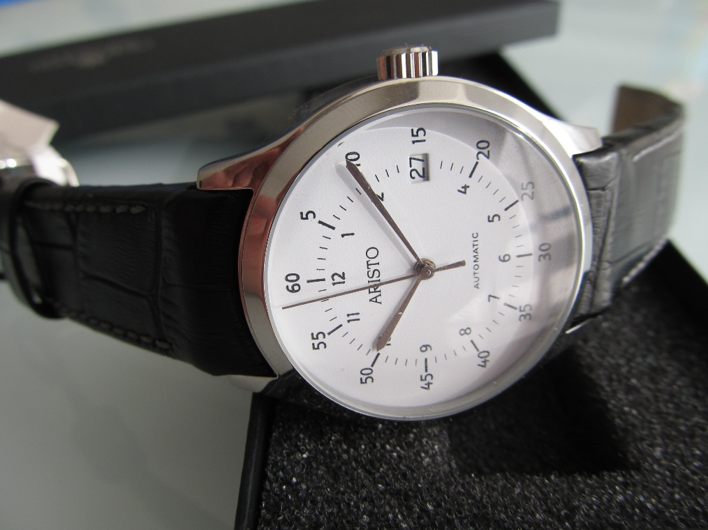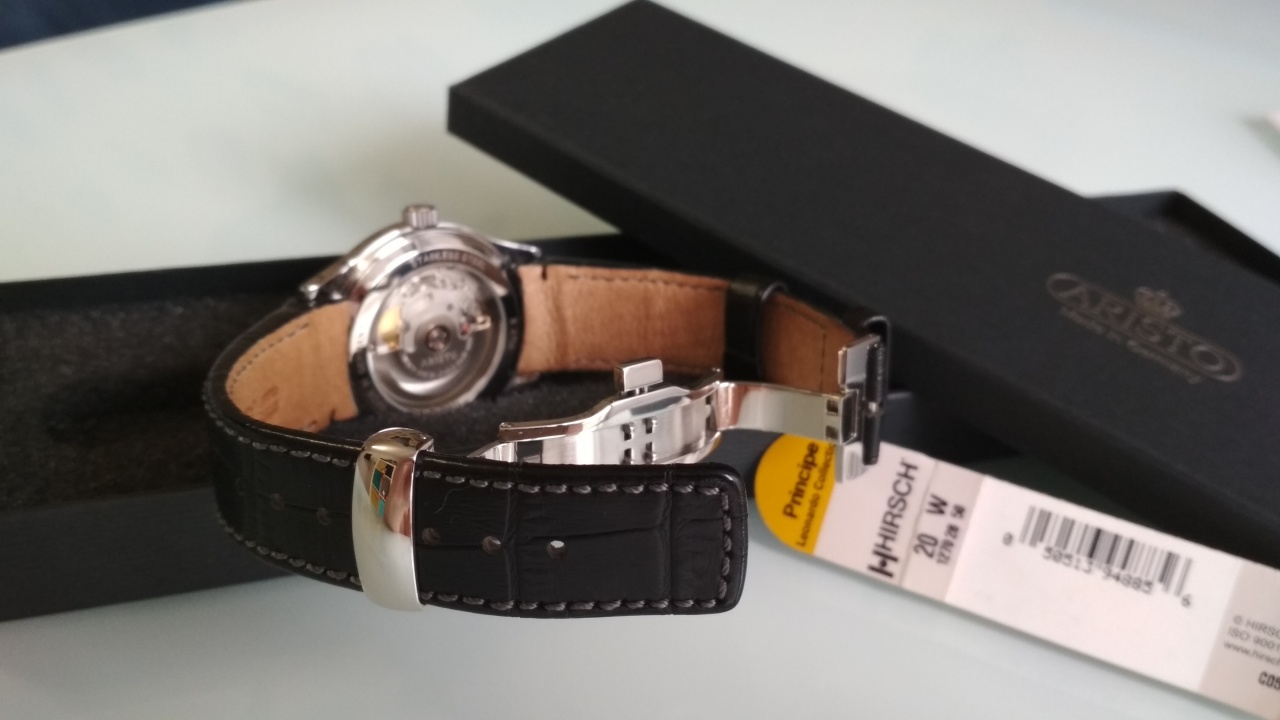 Родной ремешок сразу был заменен на более подходящий HIRSCH Principal. Ремешок HIRSCH Principal имеет скругленные выемки на концах, прилегающих к корпусу часов. Это позволяет добиться гармоничного внешнего вида. В торцах ремешка находятся квадратные в сечении пластиковые вставки, которые позволяют позиционировать ремешок в четырех различных вариантах для того чтобы добиться максимального прилегания к корпусу часов. Ремешок подогнан к данным часам, делает их вид более лаконичным.