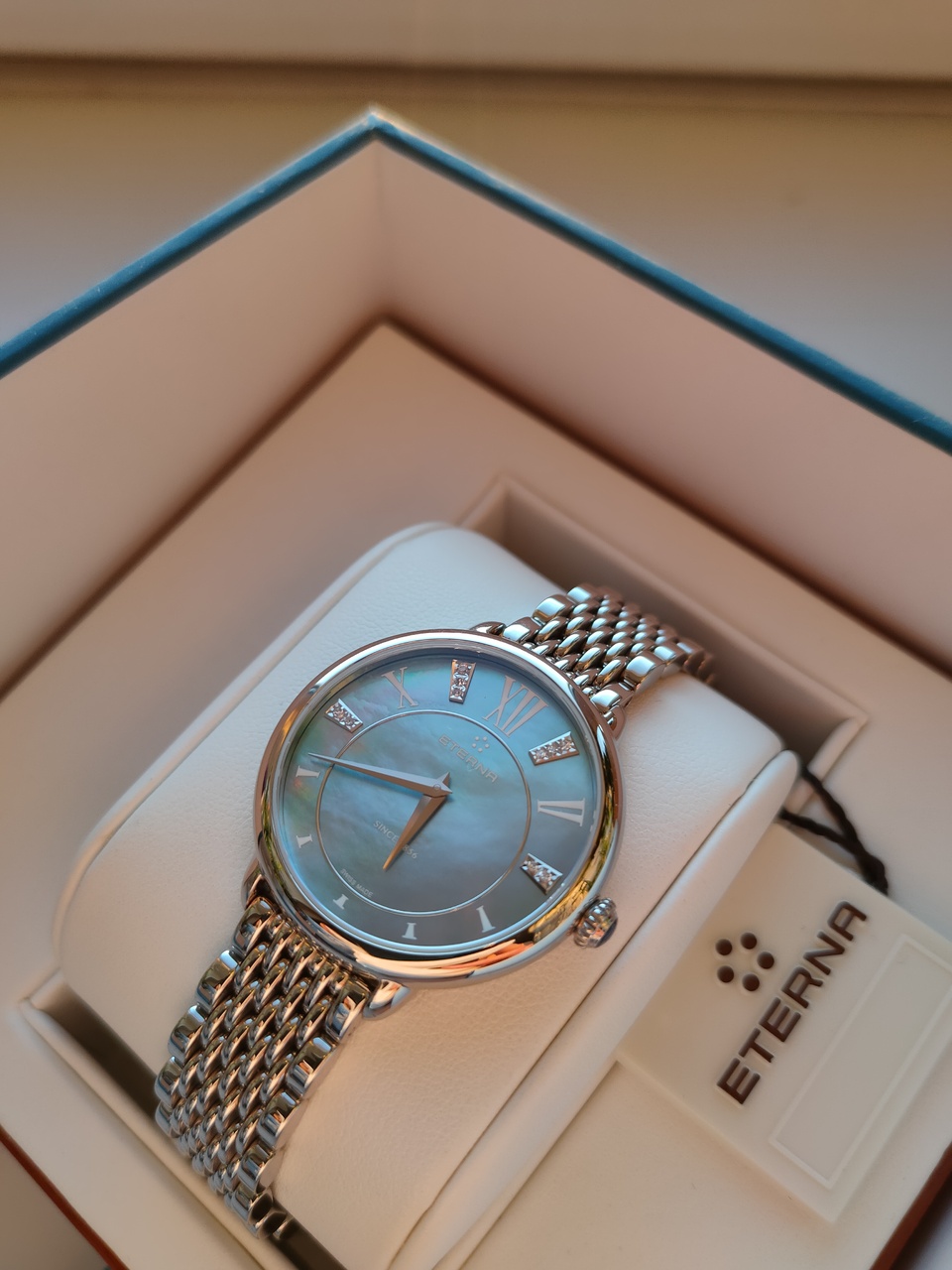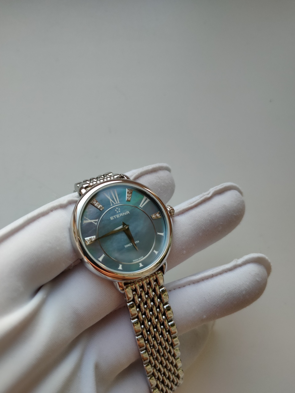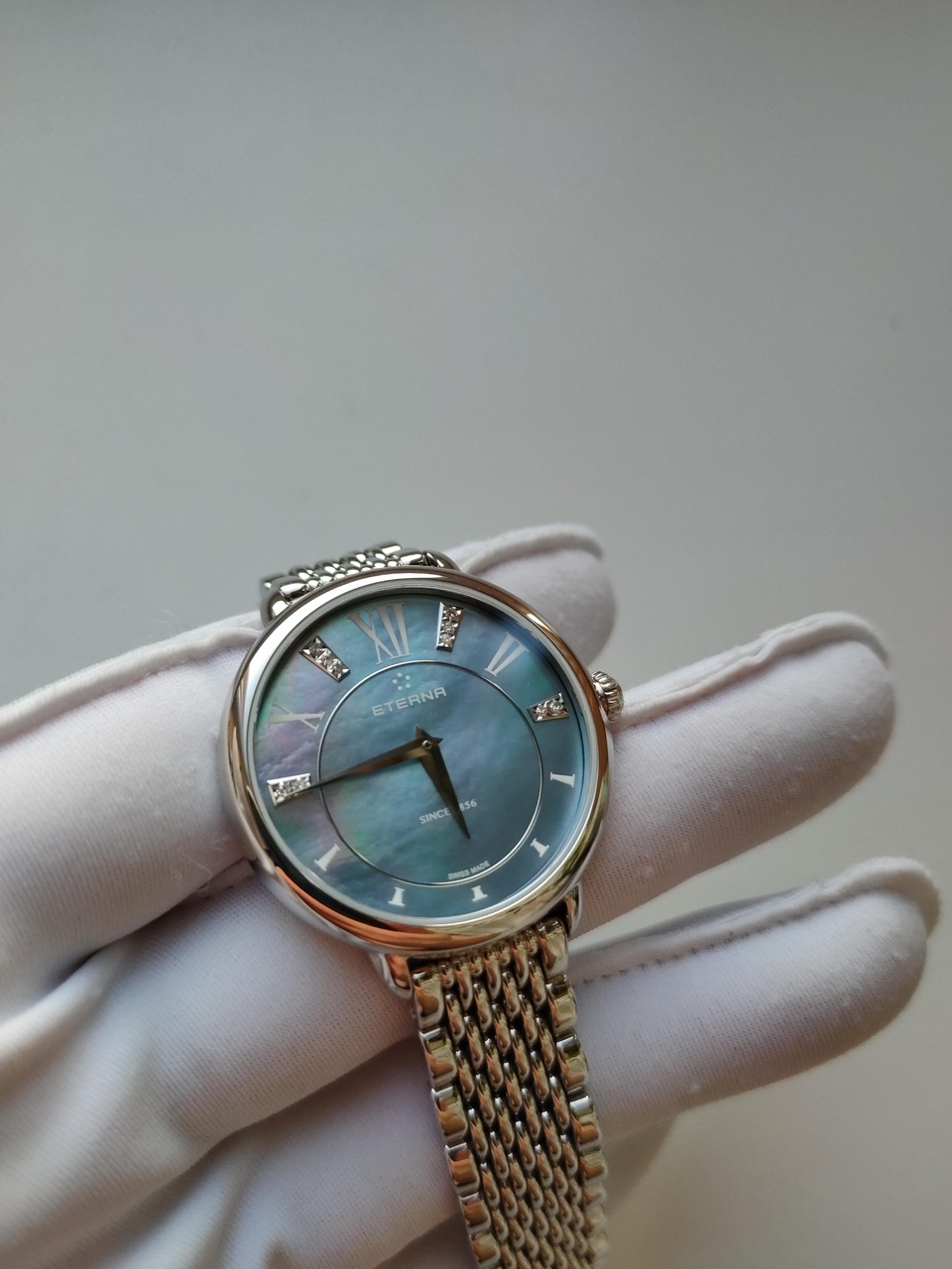 Предлагаю к продаже шикарные часы от уважаемого производителя. У данной модели просто бесподобный цвет перламутра на цифере. В сумме с накладными метками с бриллиантами (10 штук) просто бомба! Остальные характеристики тоже не подвели: дорогой калибр ETA, классный браслет с раскрывающейся застежкой, кабошон в заводной головке. В живую часы выглядят намного красивее и богаче чем на фото. Осенняя пасмурная сибирская погода, к сожалению, украла долю качества фото при съемке