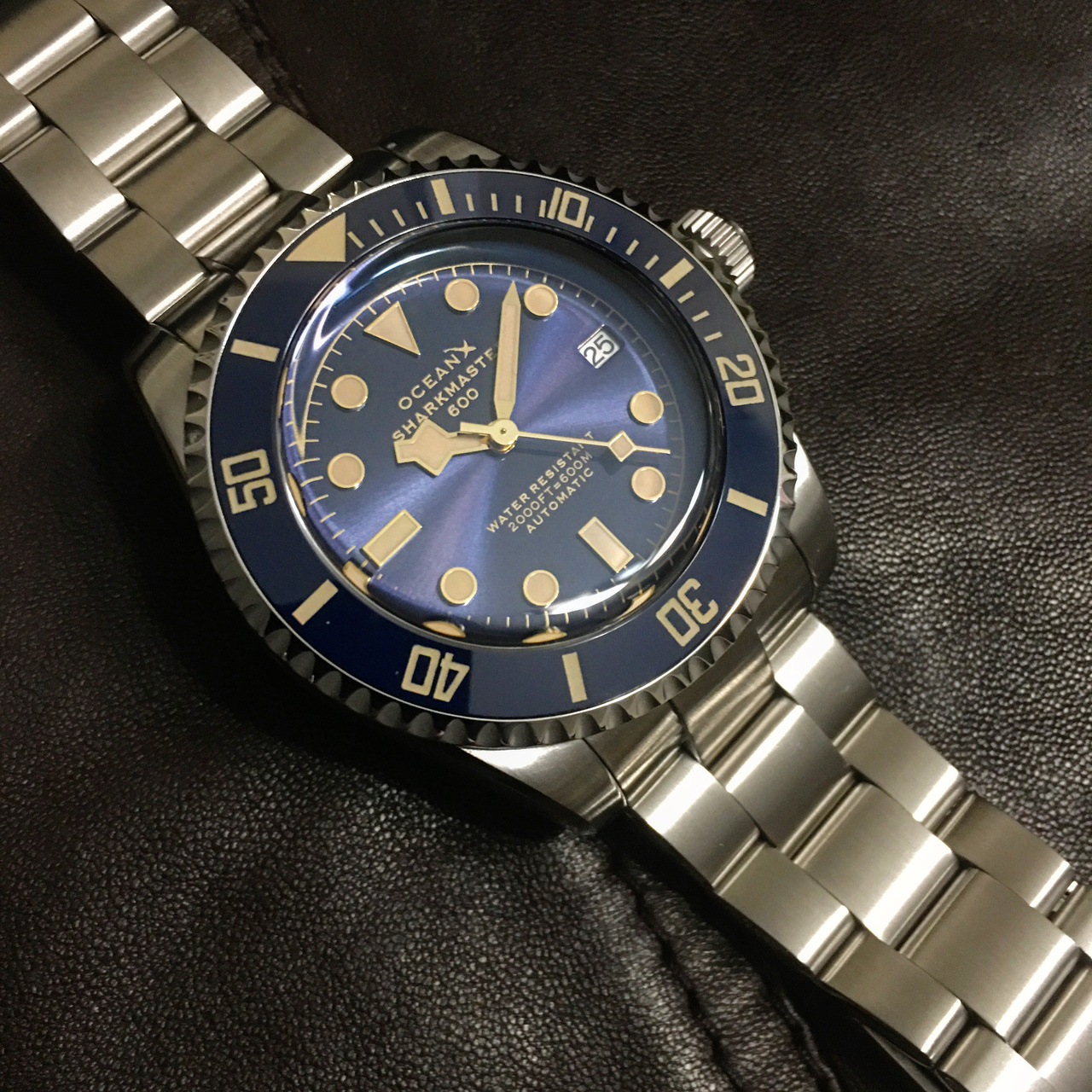 1. Sharkmaster 600. Как можно уже догадаться, это дайверские часы с водозащитой 600 м. Купольный 3,8мм сапфир, керамический безель со светящимися метками, гелиевый клапан, шикарный циферблат с эффектом "солнечные лучи" и неубиваемый механизм Seiko NH35A. Корпус 43мм, неплохо сидит на руке. Выполнен в стиле - а ля Тюдор. Браслет типа "уйстер".