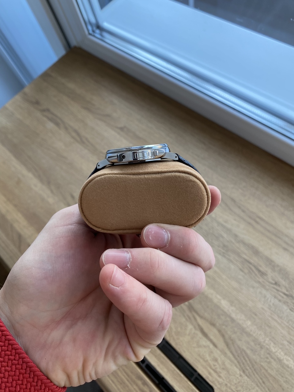 Матовая отделка черного цвета, со светящимися арабскими цифрами и часовыми метками. Малая секундная стрелка в положении «9 часов».