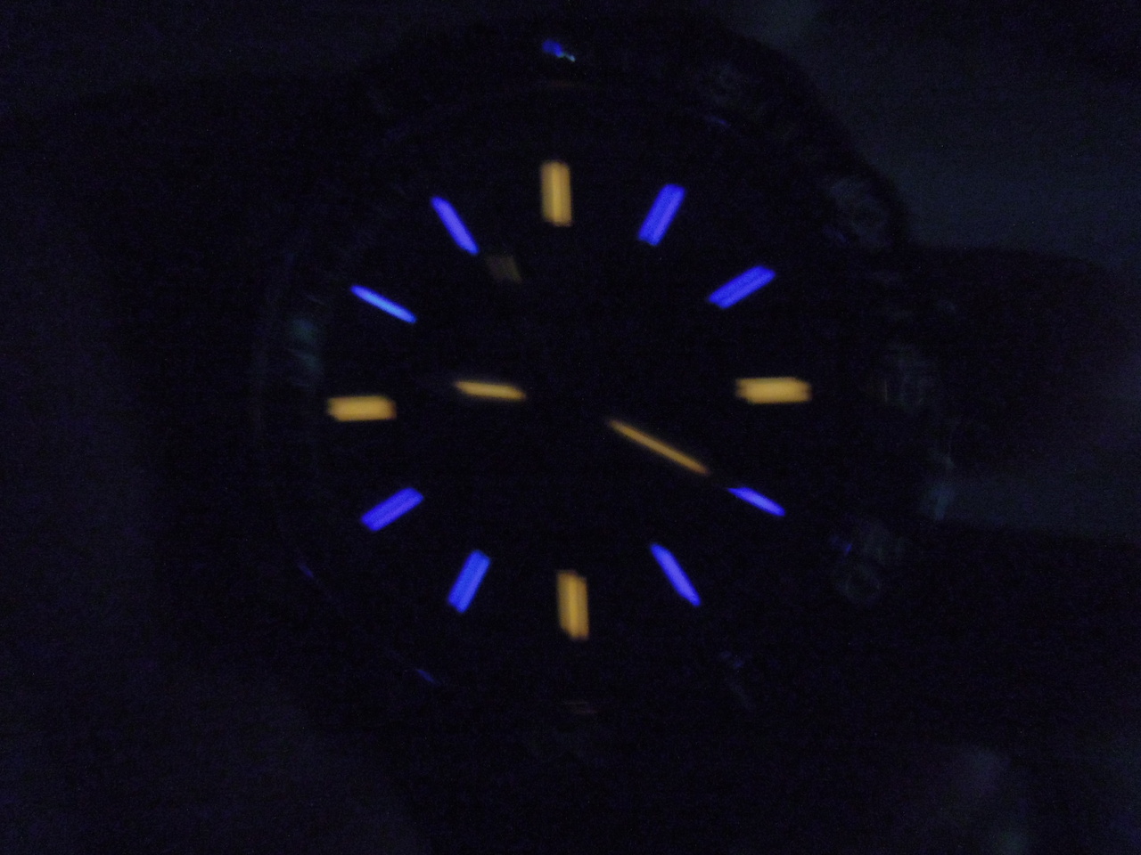 Циферблат с тритиевыми трубками: 12,3,6,9 двойные оранжевые, 1,2,4,5,7,8,10,11 синие, стрелки - светло-оранжевые.