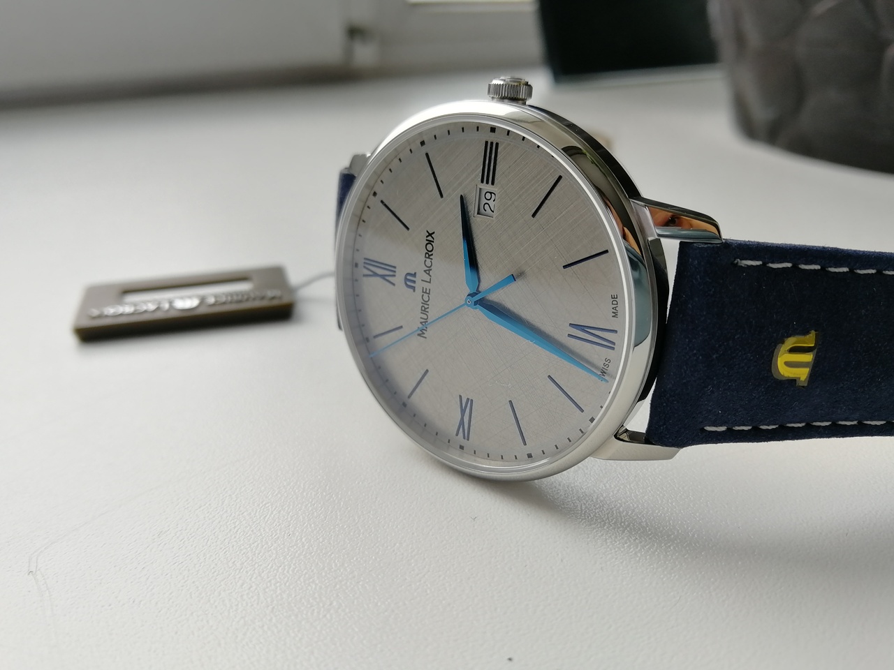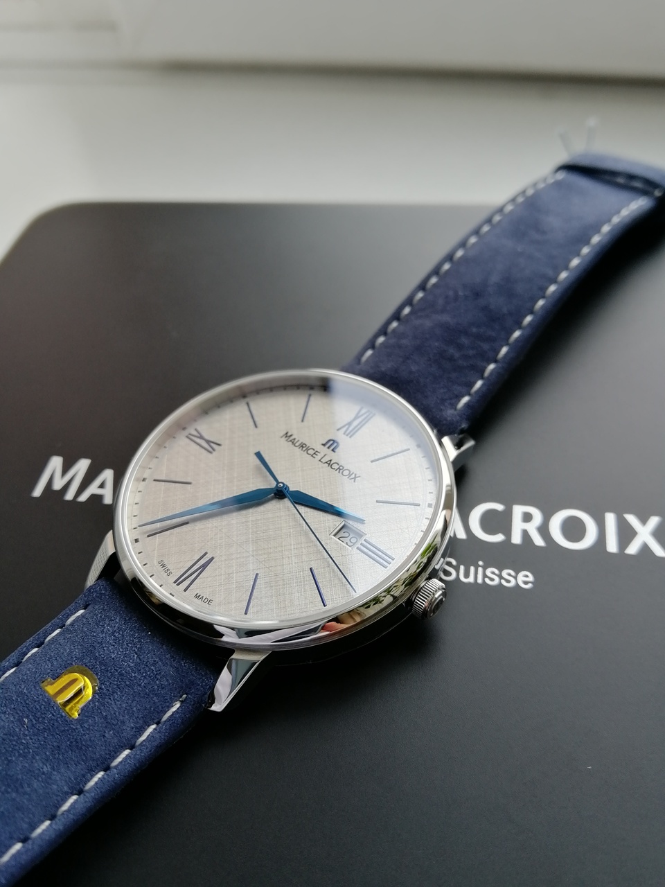 В продаже шикарные и довольно редко встречающиеся классические часы от именитого бренда с очень интересным и запоминающимся дизайном. Серебристый цифер с текстурой похожей на ручное раскрашивание карандашом, синие стрелки, красиво играющие и переливающиеся на солнце, синий кожаный ремешок отличного качества. Цифер смотрится очень богато и необычно. Уровень исполнения и внимания к деталям на высоте. Восторженные и заинтересованные взгляды окружающих обеспечены