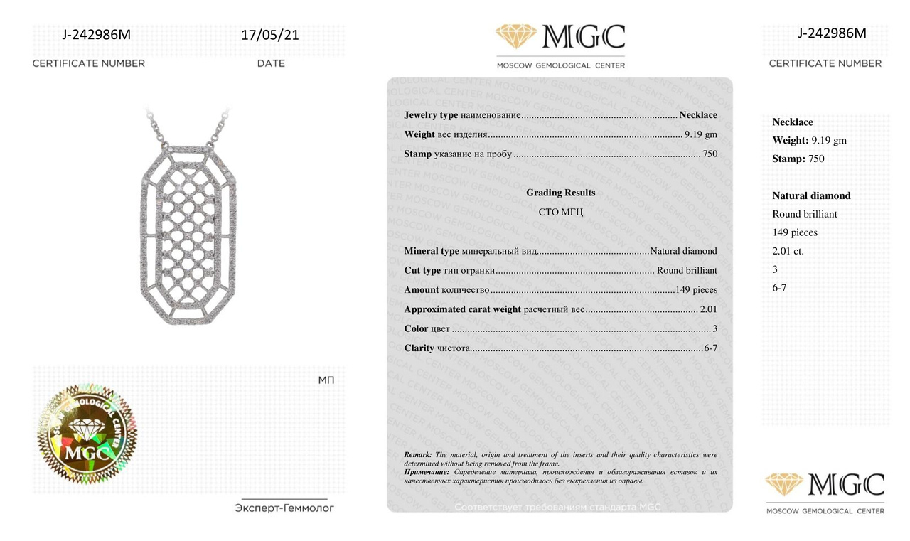 Подвеска из белого золота с бриллиантами 2,01 карат (сертификат МГЦ)