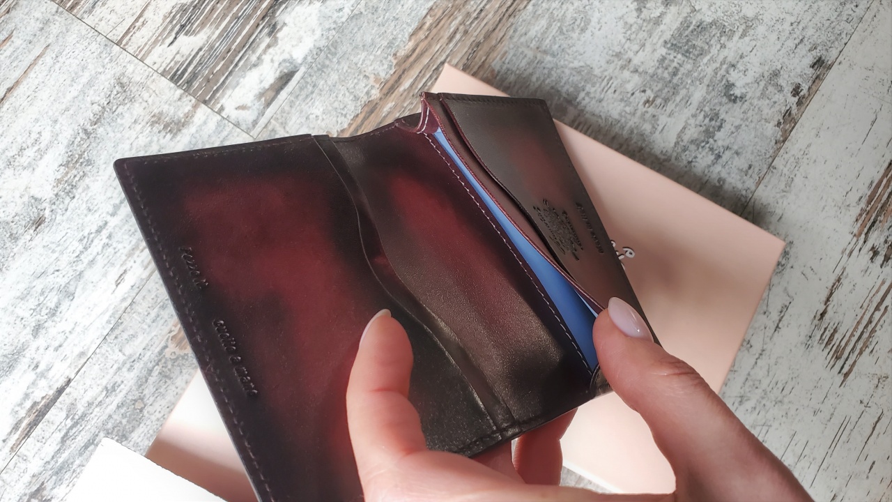 Кардхолдер имеет вместительное основное отделение для кредитных карт или визиток, отделенное внутри кожей ягнёнка голубого цвета, и три три отделения для визитных карточек, отделанные внутри текстилем чёрного цвета.