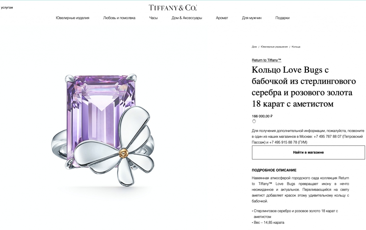 Кольцо *TIFFANY* Love Bugs с бабочкой из стерлингового серебра и розового золота 18 карат с аметистом