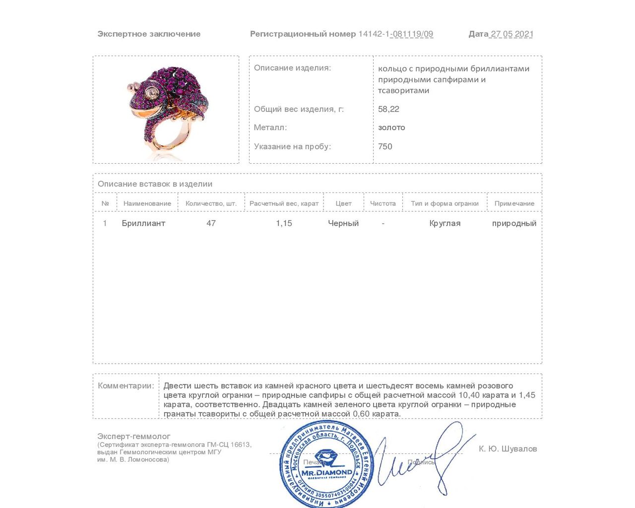 Представляем вашему вниманию итальянское золотое кольцо с черными бриллиантами 1.15ct, красными сапфирами 10.40ct, тсаворитами 0.60ct и розовыми сапфирами 1.45ct.