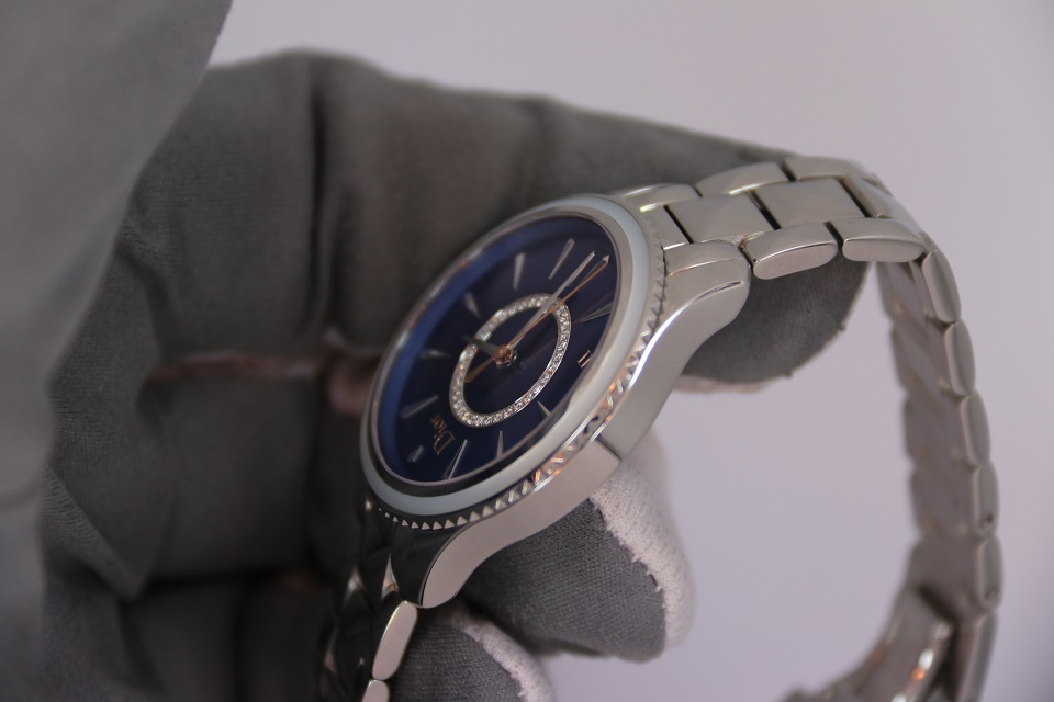 Перламутровый безель. Циферблат украшен бриллиантами.