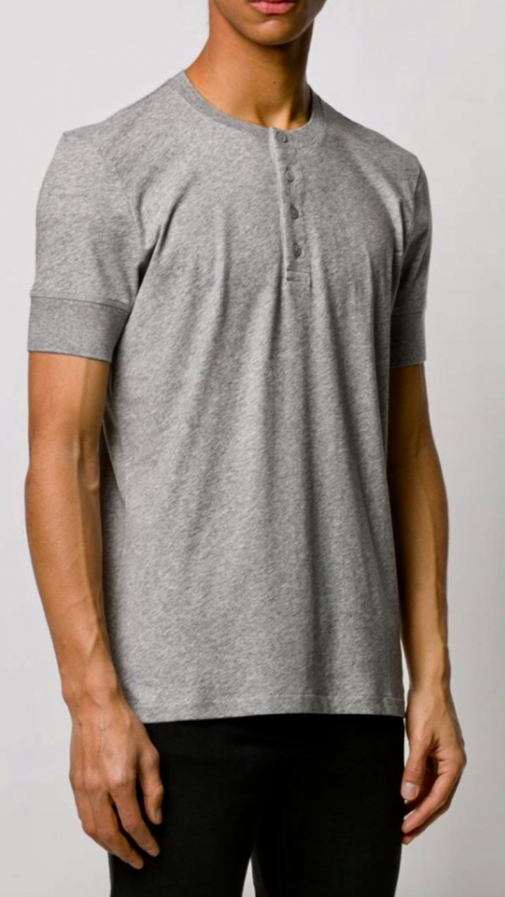 Для создания модели серого цвета с широкими эластичными манжетами TOM FORD выбрал тонкое мягкое джерси на основе лёгкого хлопка.Переплетение волокон разного оттенка образует меланжевый эффект.Футболка с круглым вырезом под горло имеет застёжку на пуговицы спереди,короткие рукава,прямой подол.