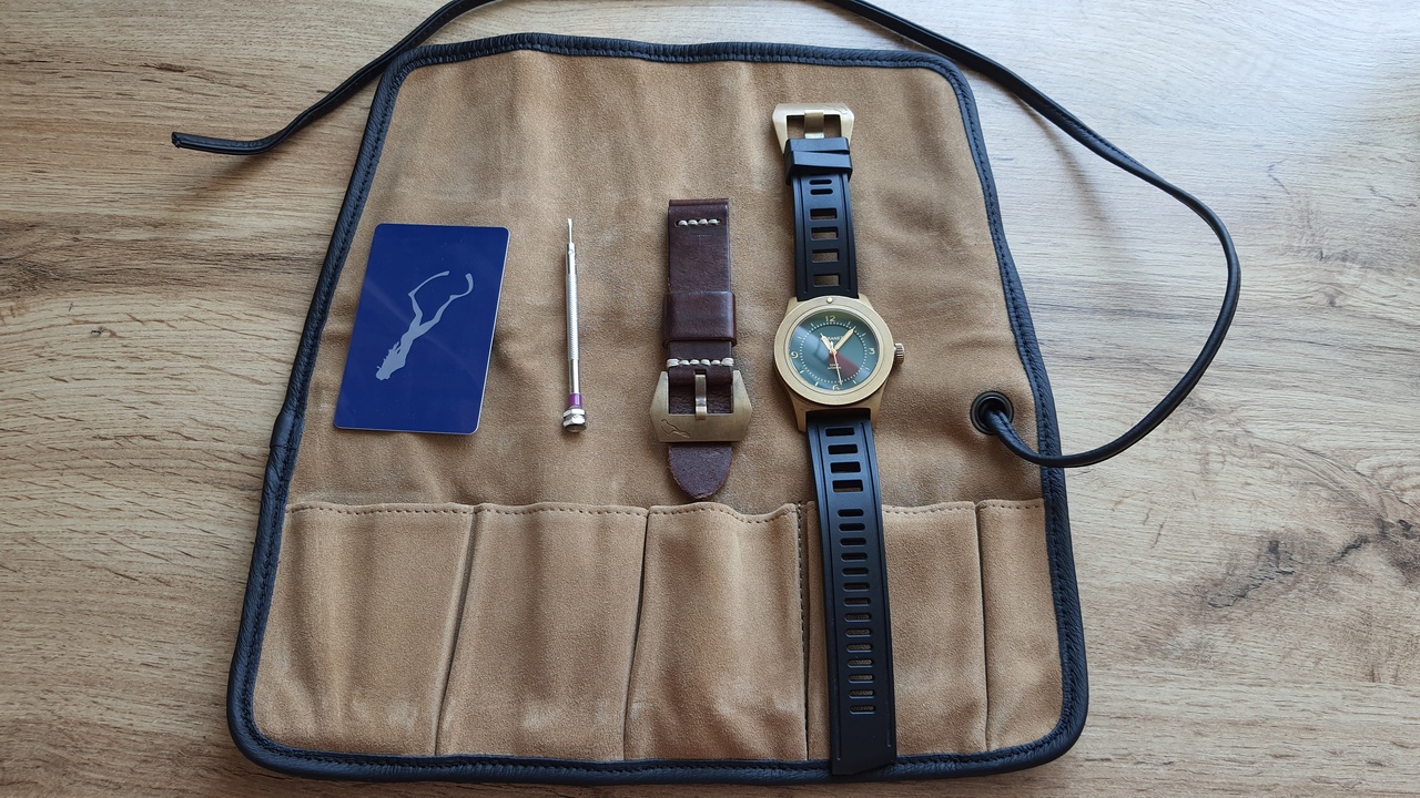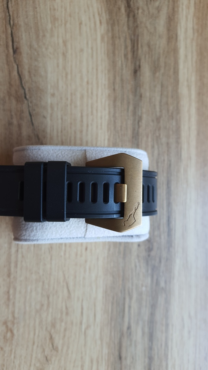 Ремешки - резиновый и кожаный. Каждый ремешок со свей латунной баклей.Ширина 24мм.