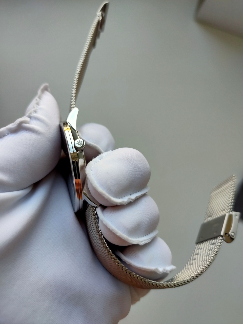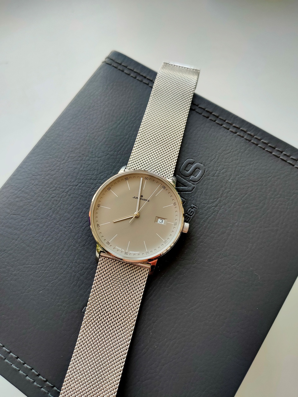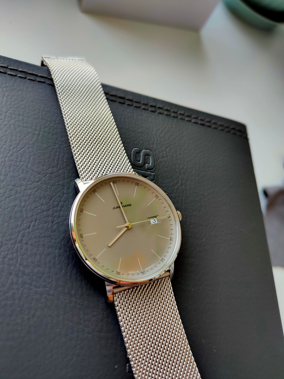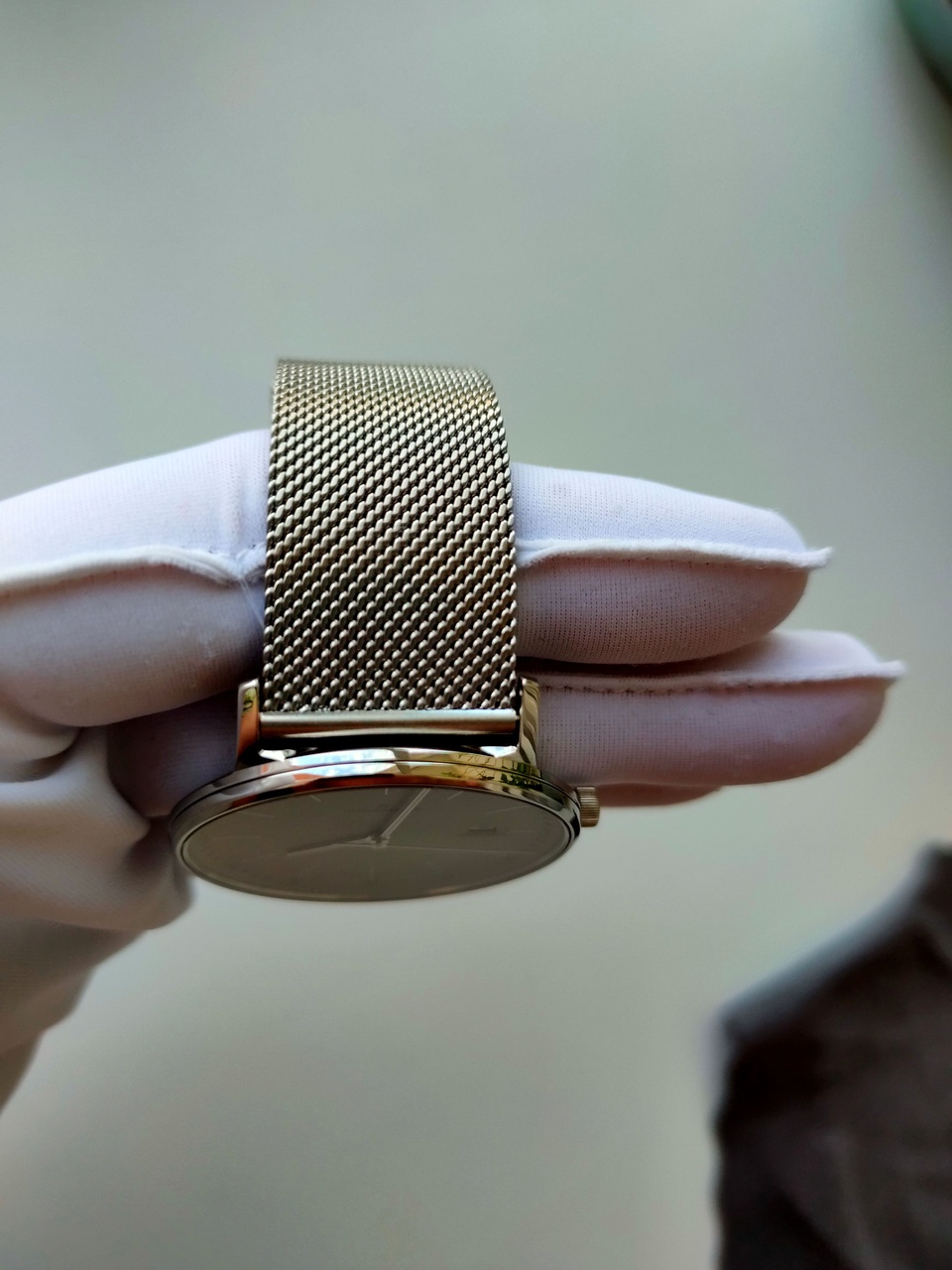 В продаже идеальный образец баухауса от уважаемого немецкого производителя с более чем 150-ти летней историей! Эталон перфекционизма, лаконичности и сдержанной роскоши. В живую часы выглядят намного интереснее чем на фото и приятно удивляют. Положительные впечатления начинаются еще с того момента когда берешь в руки шикарно оформленную коробку и невольно начинаешь осознавать, что имеешь дело с хваленым немецким качеством А качество исполнения действительно находится на очень высоком уровне. Гибкий миланский браслет идеально облегает запястье и способствует очень удобной посадке часов. Интересный цвет цифера - в зависимости от освещения переливается от серо-болотного до коричнево-молочного. Секундная стрелка практически идеально попадает в метки