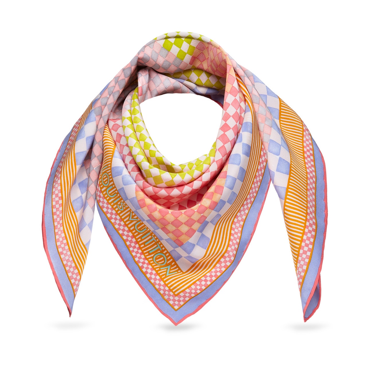 "Знаменитый узор Louis Vuitton Damier приобретает сияние летних оттенков в платке-каре коллекции Damier Aquarelle. 17 цветов в великолепном акварельном стиле создают идеальный весенне-летний аксессуар."
