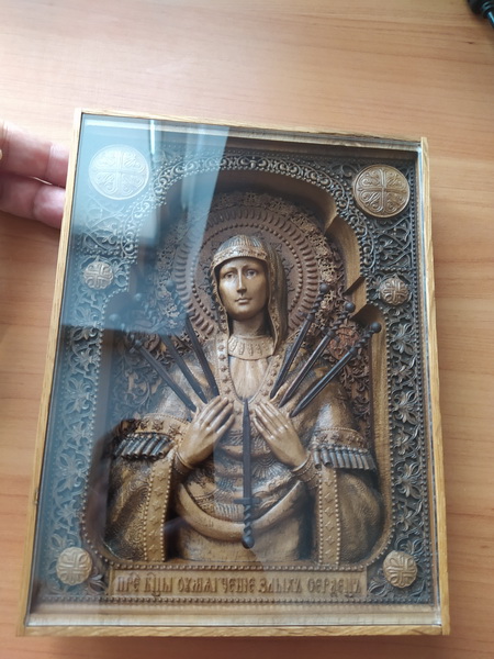 Одна из самых почитаемых икон. Качество и степень детализации на фото. Икона выполнена из светлого ореха, подложка и рамка - дуб, нимб - красное дерево, решетка на подложке - темный орех, мечи - темных орех. Защитное стекло установлено для сохранности плотной посадкой без клея, может быть легко снято или закреплено капелькой клея (но оно и так само собой не выпадет). В такой сложности работа скорее всего повторяться не будет из-за огромной трудоемкости и технологической сложности. Шикарный подарок супруге, маме, сестре. Технология - ЧПУ, фреза 0,25 и руки, руки, руки. Пропитка - только натуральное, химией не пользуюсь никогда. Масла с восками (хитрая смесь) и сиккатив для ускорения полимеризации.