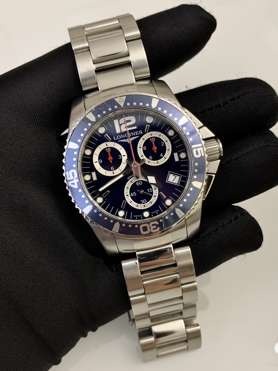 мужские Longines Hydroconquest L3.643.4.96.6. Технически все в порядке. Браслет на руку до 20 см в окружности запястья. (на фото рука 19 см + 1 доп. звено)