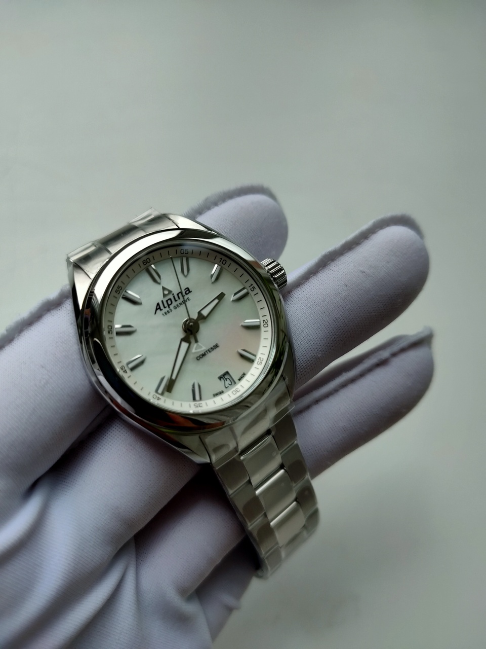 Предлагаю к продаже шикарный женский повседневник, подходящий на все случаи жизни - модель Alpina Comtesse с перламутровым цифером. Часы исполнены максимально качественно - отличный литой браслет с застежкой-бабочкой, шикарный перламутровый цифер с накладными элементами и отличным люмом на метках и стрелках, безупречное качество полировки и сатинирования поверхностей. Соотношение цена/качество на высочайшем уровне