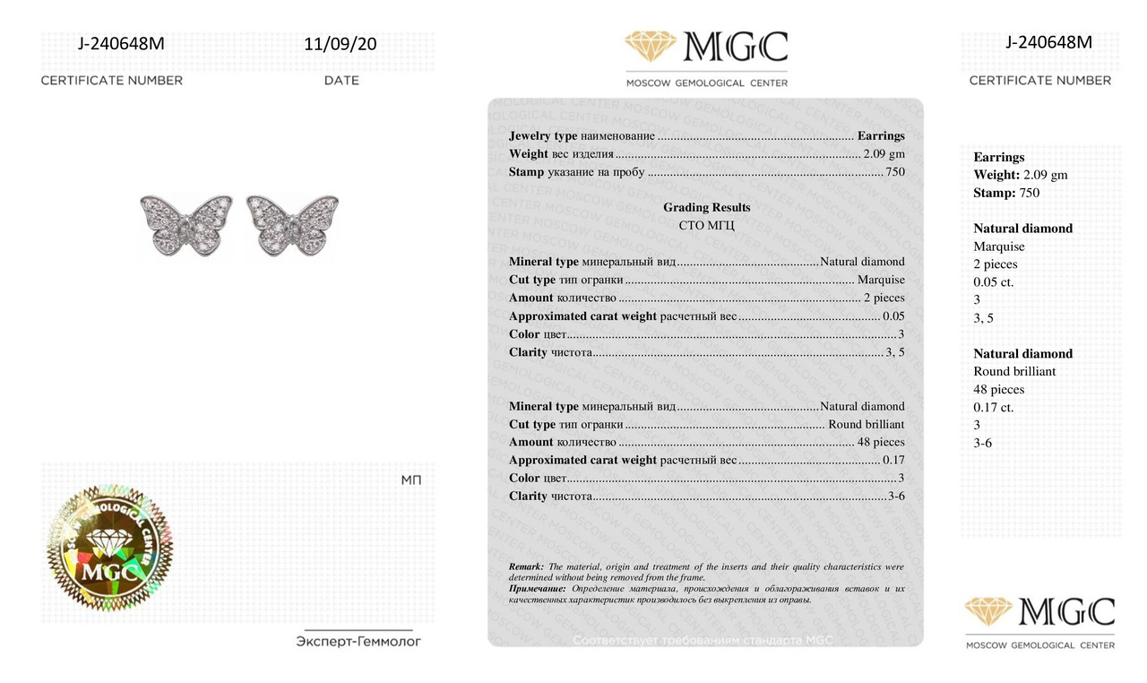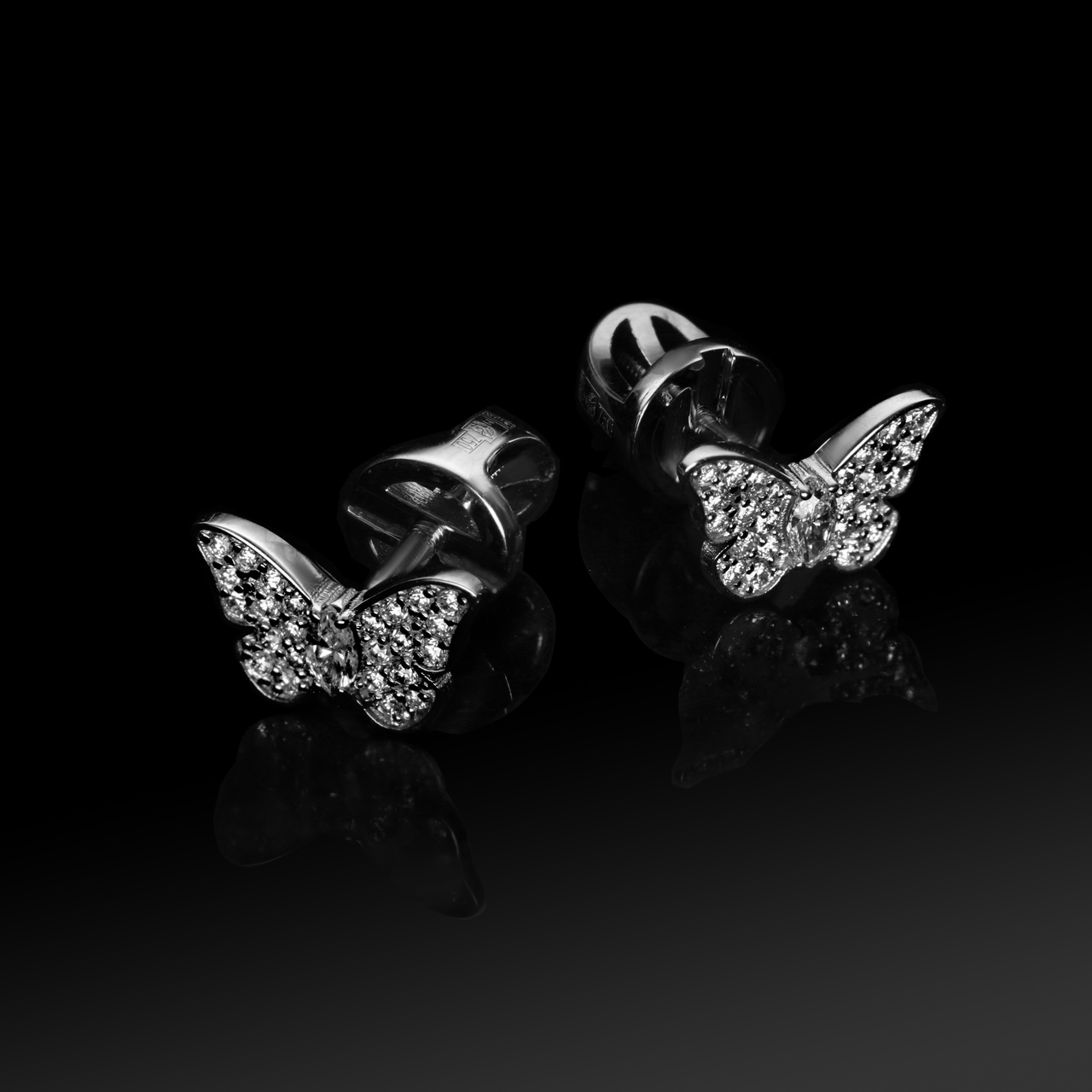 Серьги-пуссеты (бабочки) из белого золота с бриллиантами 0,22 карат (сертификат МГЦ)