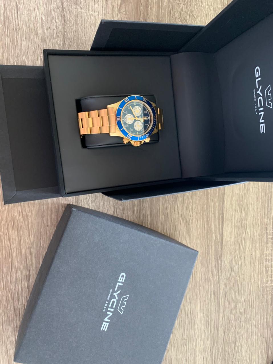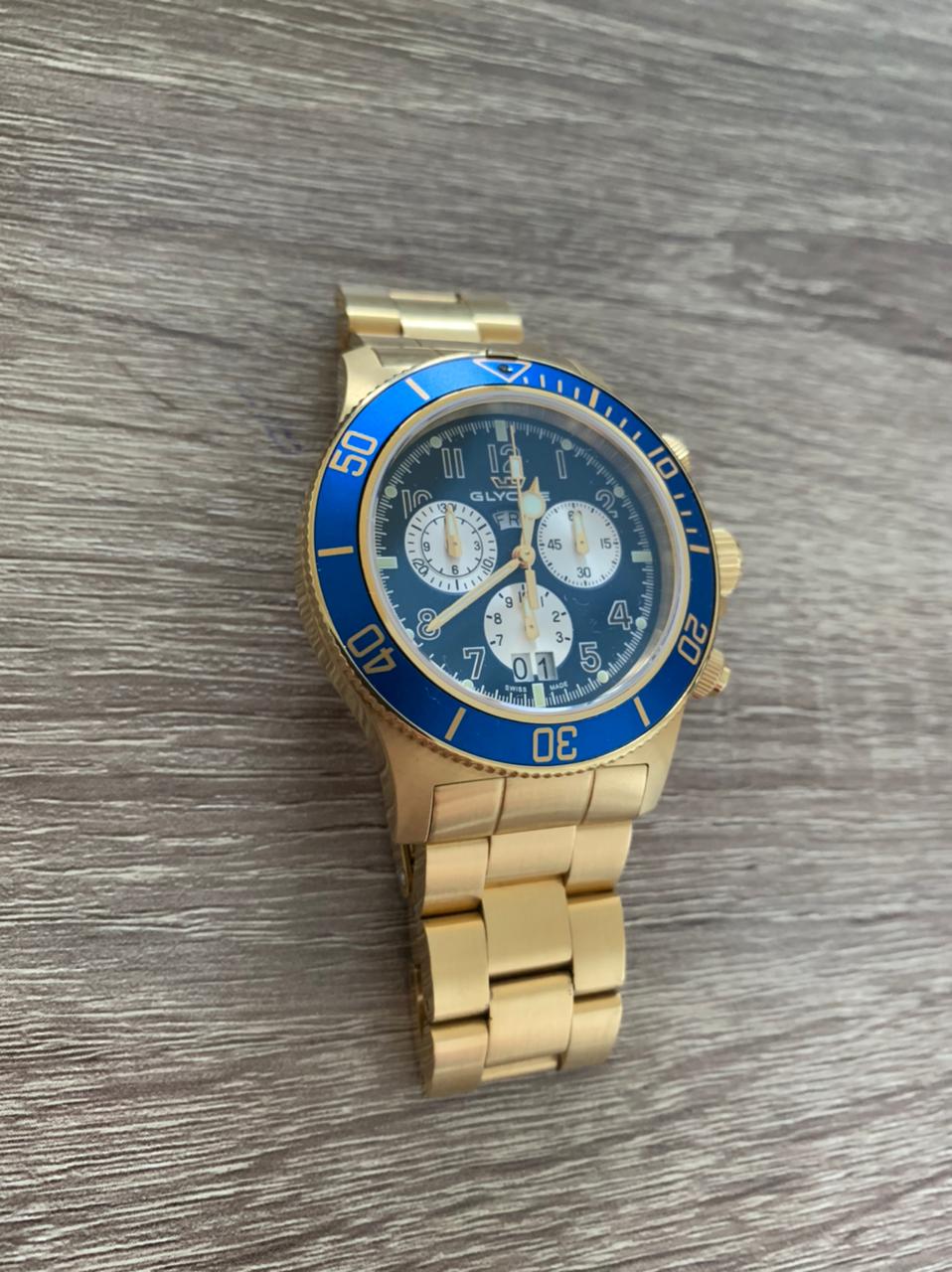 Отличные швейцарские часы Glycine в потрясающем золотом цвете с шикарным синим безелем и циферблатом.