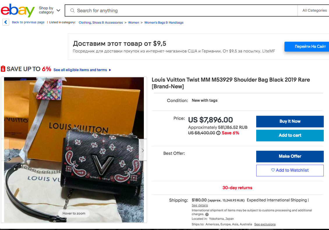 Стоимость в Louis Vuitton: 315.000 руб. Обращаю внимание, что такие редкие лимитированне аксессуары LV на вторичке продают часто дороже цены бутика, см. скриншот: на Ебей за нее просят $7896 - 581 тыс руб. Сравните с моей ценой)